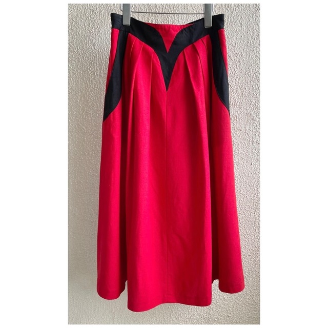 フランス買付 ヴィンテージ スカート フレアスカート ミドル丈 バイカラー リネン レッド