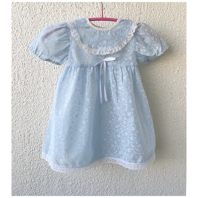 フランス買付 ヴィンテージ キッズ 襟付きワンピース レースドレス フレアスカート ロールアップ袖 パステルブルー