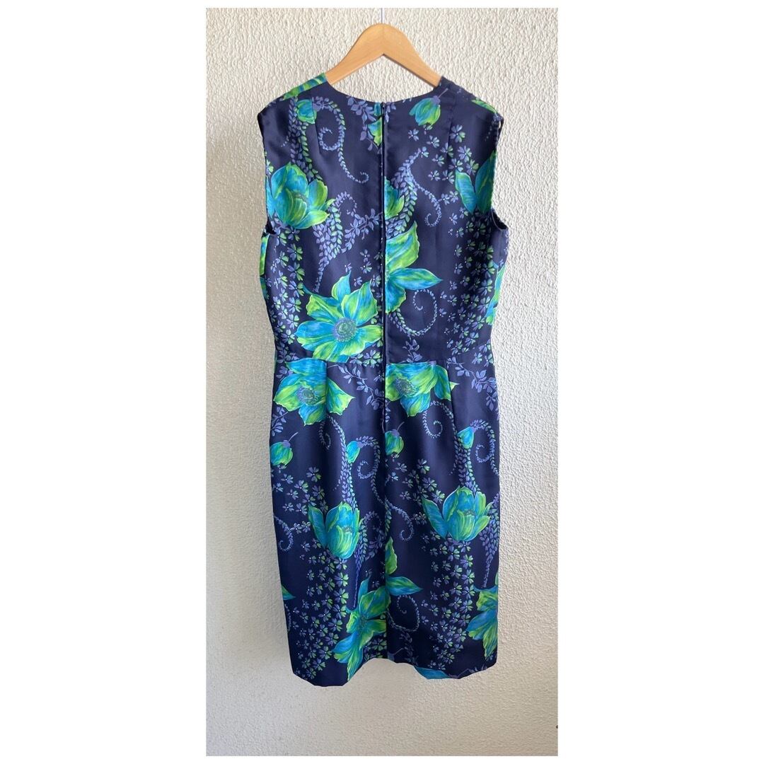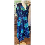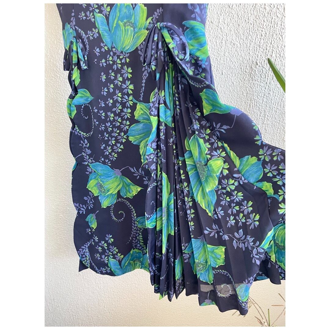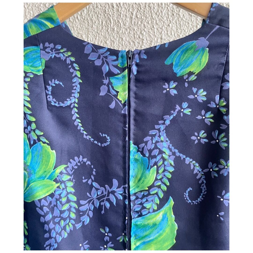 ネイビーベースにエメラルドグリーンの大ぶりなお花模様が鮮やかなスリーブレスワンピース。デコルテをきれいに見せてくれるスカラップネックに、スカートはサイドにプリーツが隠れていて、動くと揺れて動きが出るとても凝ったデザインです。
