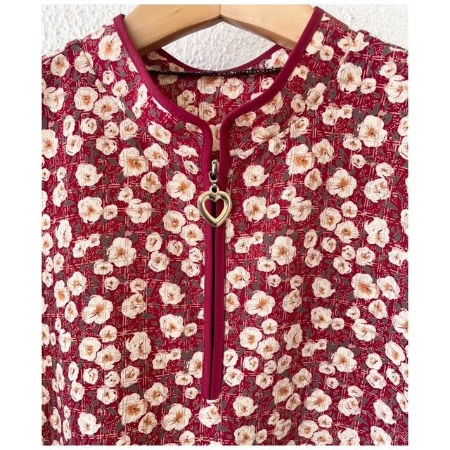 フランス買付 ヴィンテージ ブラウス ハイネック ♡ ハートジップ パイピング 花柄 格子柄 ボルドー