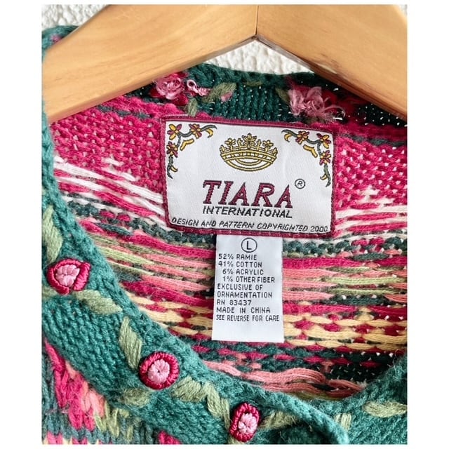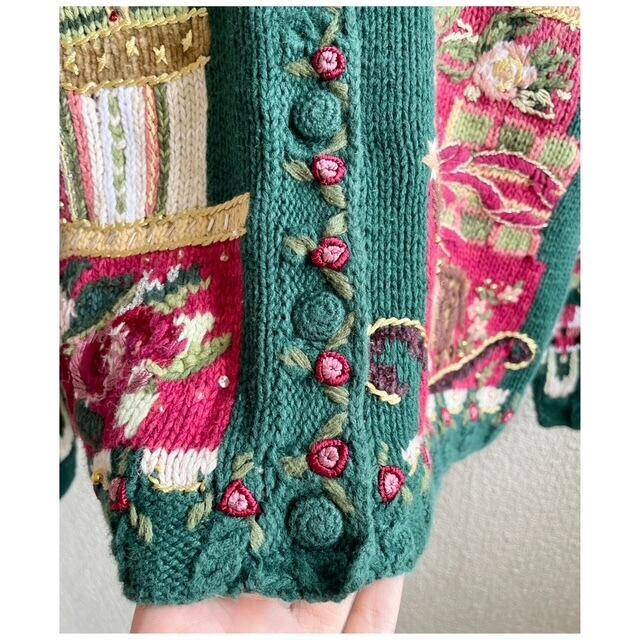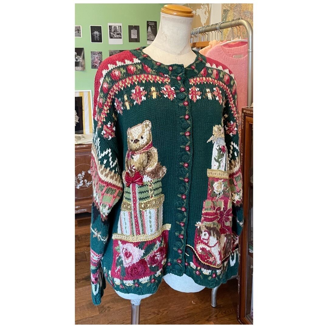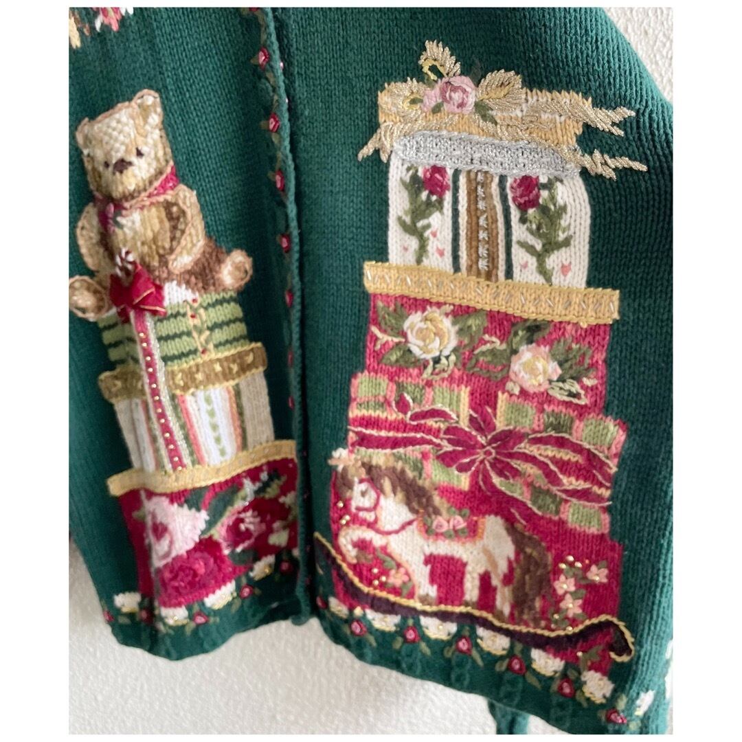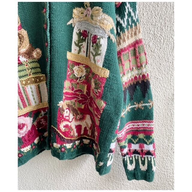 US ヴィンテージ ニットカーディガン アグリーニット ホリデーニット 刺繍 くま グリーン 送料無料