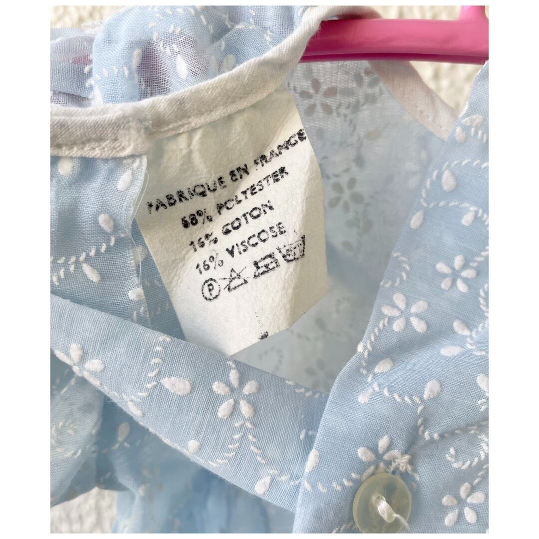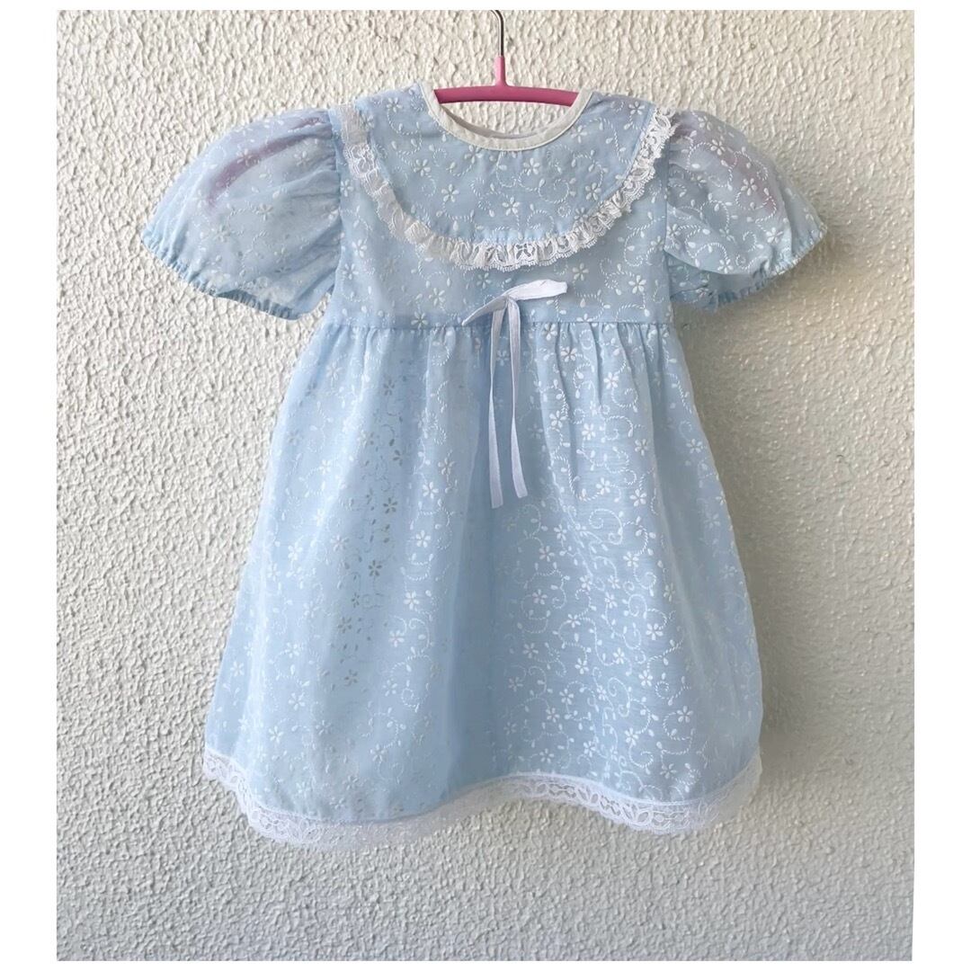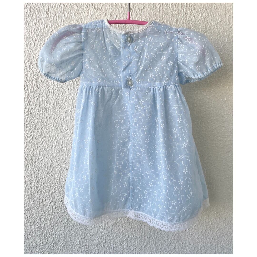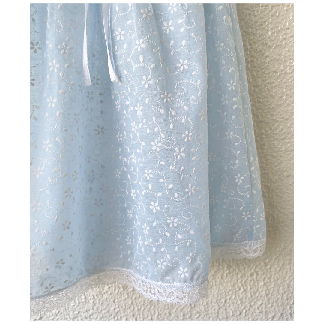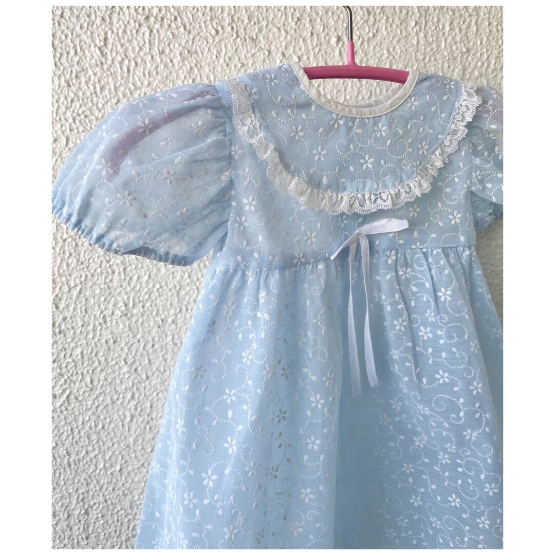 フランス買付 ヴィンテージ ベビー ベビードレス シアー パフスリーブ レース リボン 小花柄 ライトブルー