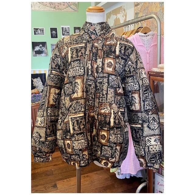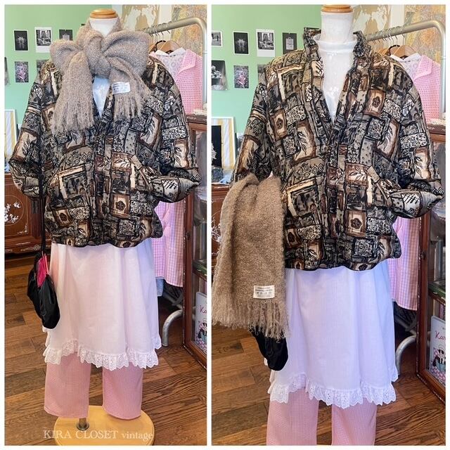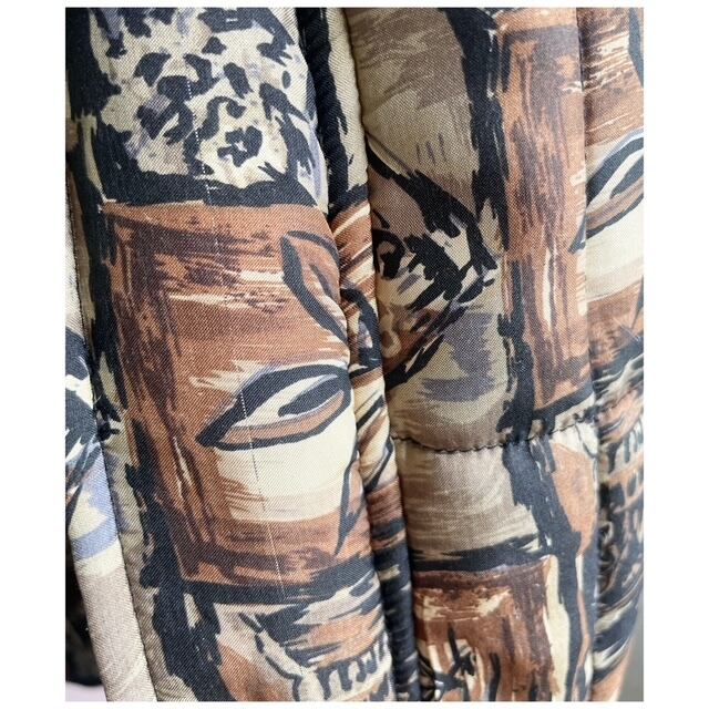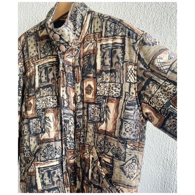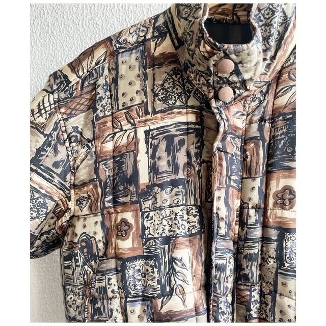 フランス買付 ヴィンテージ キルティングブルゾン シルク ジップ くるみボタン ペイント風総柄 お花 ブラウン
