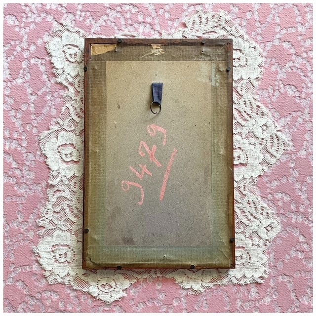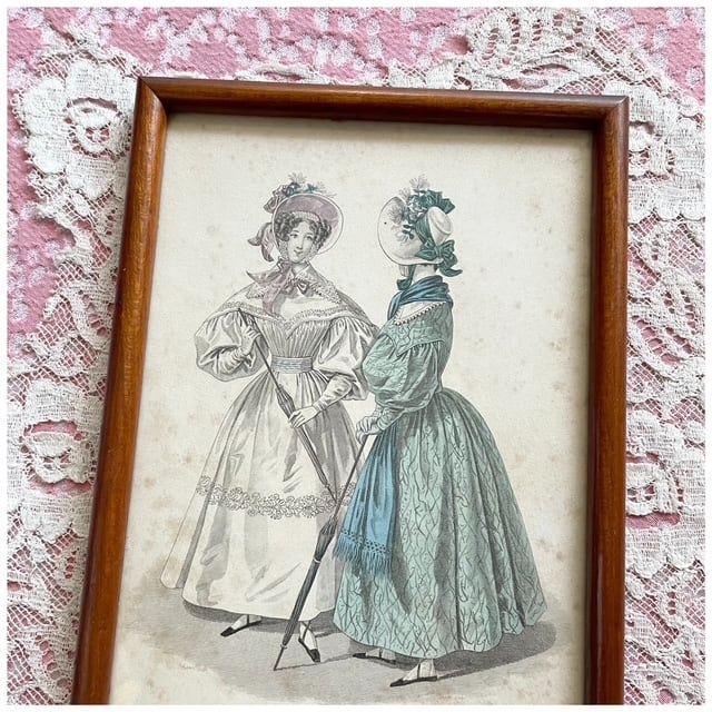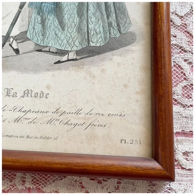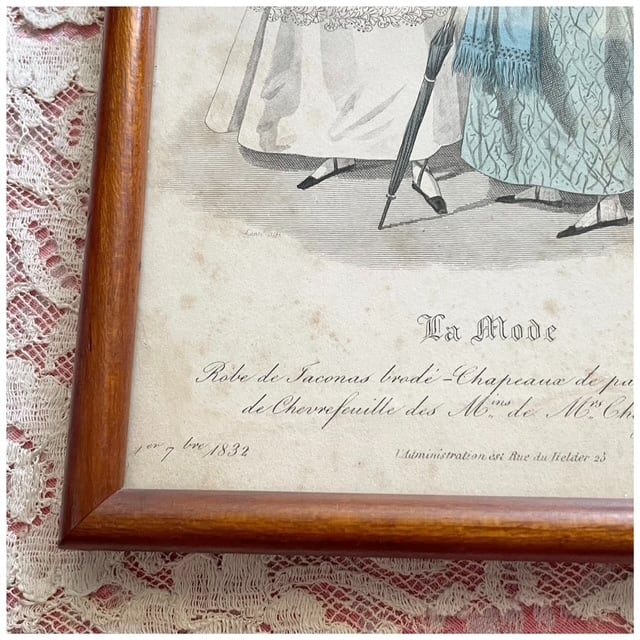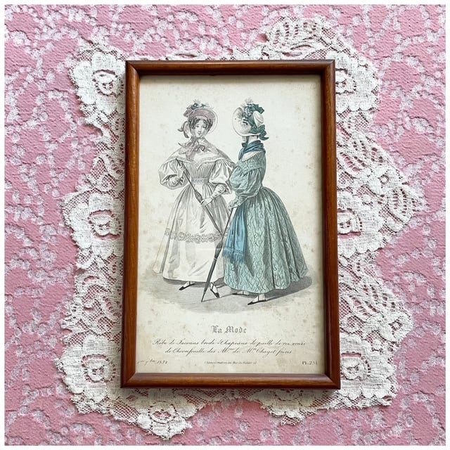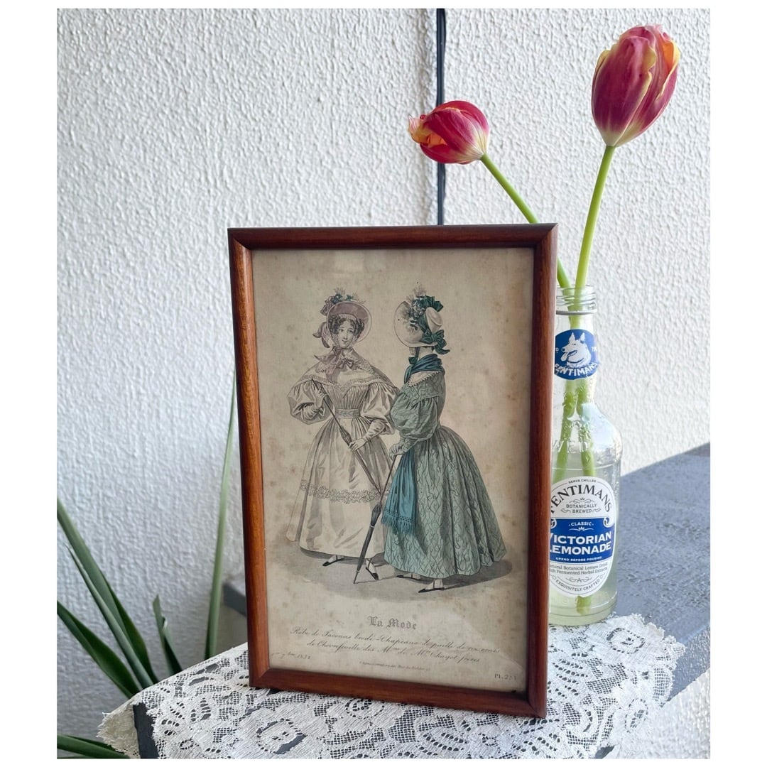 ブラウンカラーの丸みのあるウッドフレームに入ったファッションプレート。「La Mode」と題された、当時の流行服を紹介する挿絵スタイルで、19世紀らしい優雅なシルエットが描かれています。小さなシミや焼けなどありますが、時を経た紙ならではのアンティークらしい味わいが素敵。壁に掛けても、棚の上に立てかけても絵になるアイテムです◎