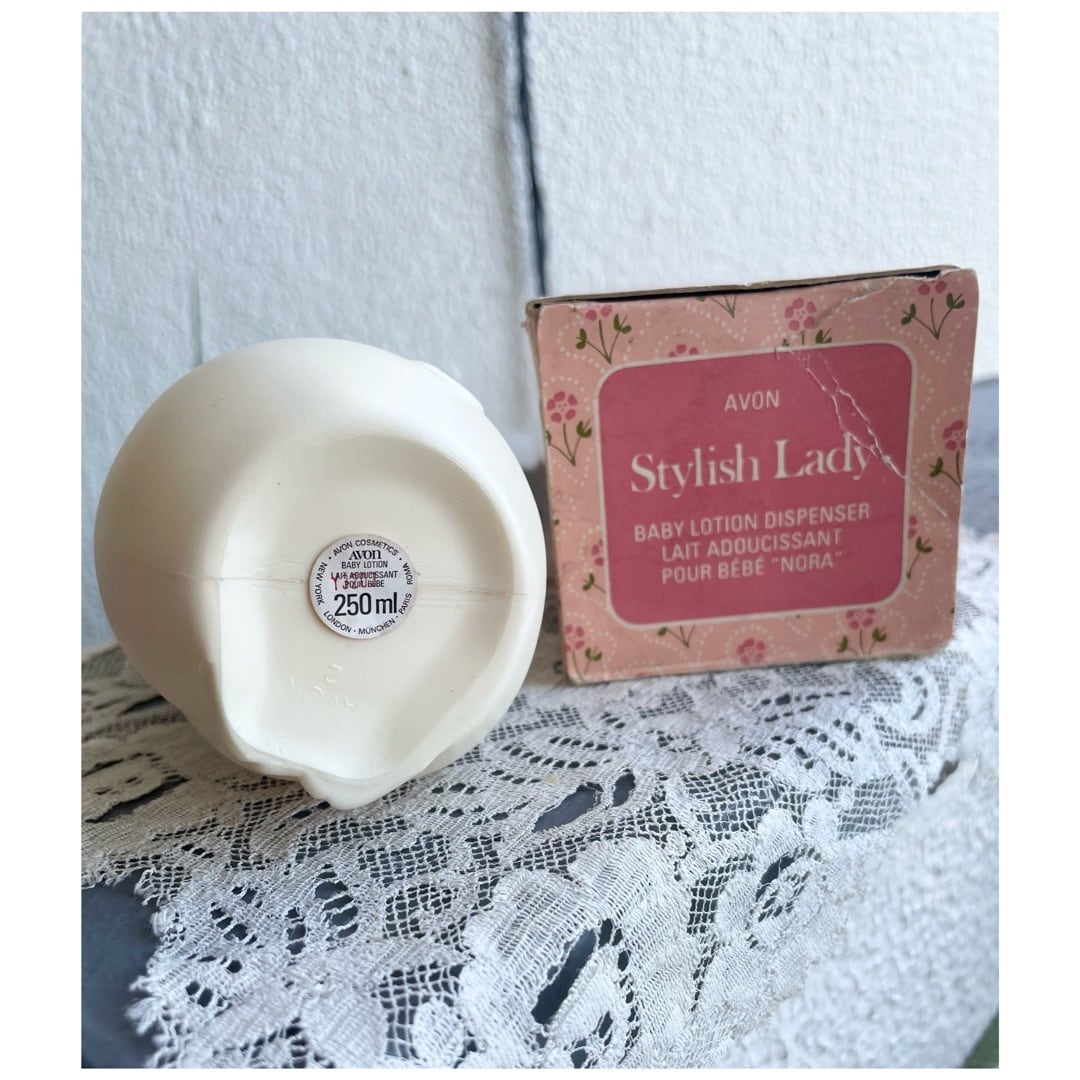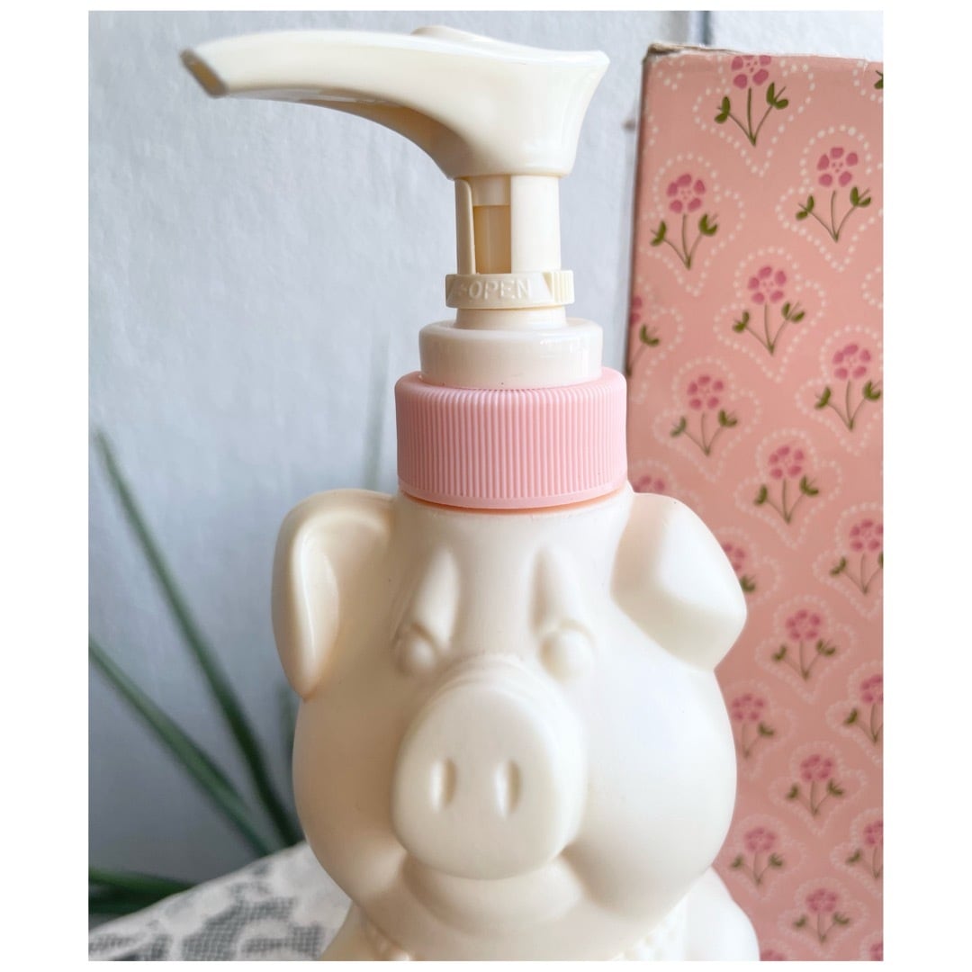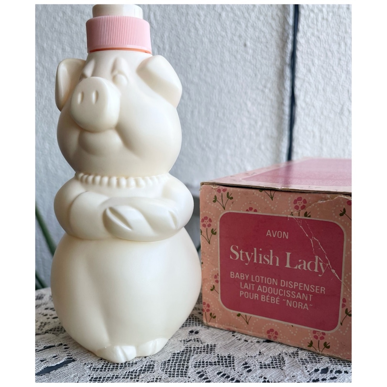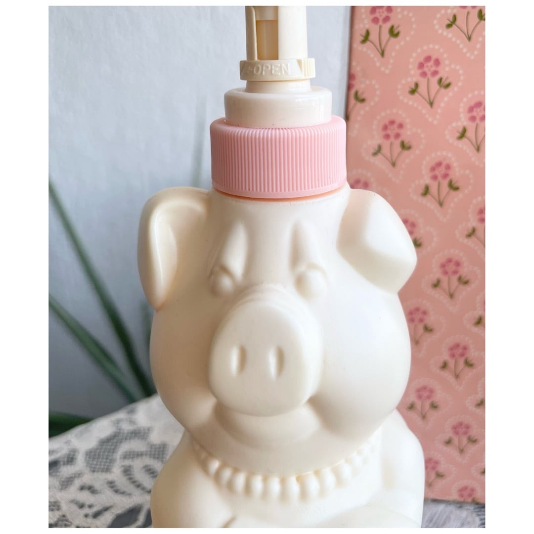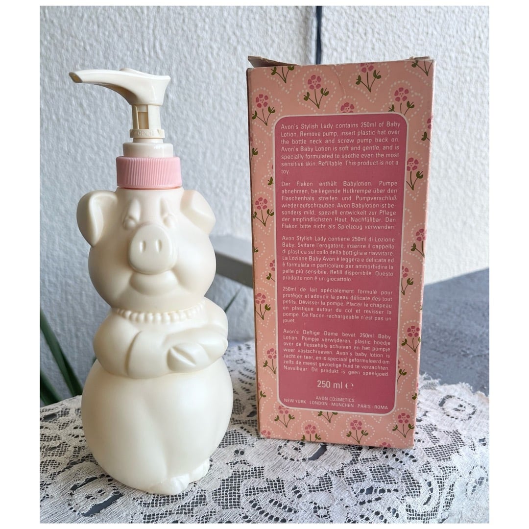 ただのパッケージではなくオブジェとしての魅力があり、コレクターさんも多いヴィンテージエイボンのブタちゃん型ベビーローションボトル。やさしいアイボリーカラーに、ころんと丸いフォルムがなんとも愛くるしく、バスルームやドレッサー、子ども部屋など飾っておくだけでもかわいい、実用性もありながらディスプレイも楽しめるアイテムです。