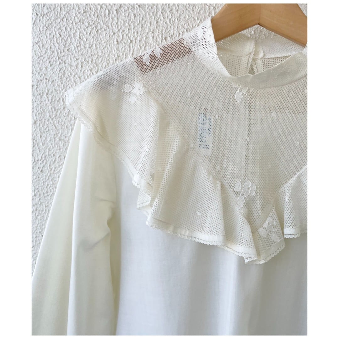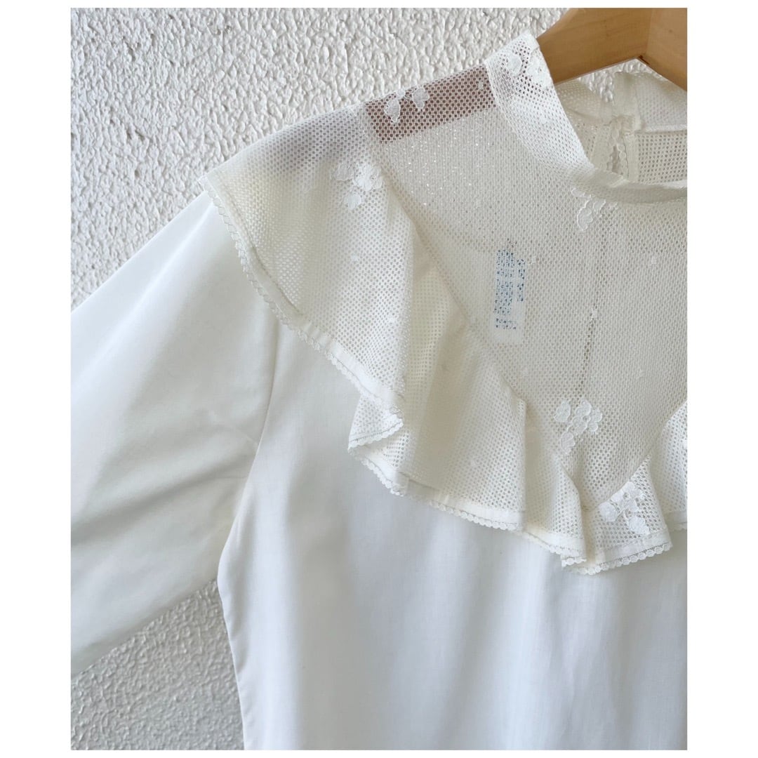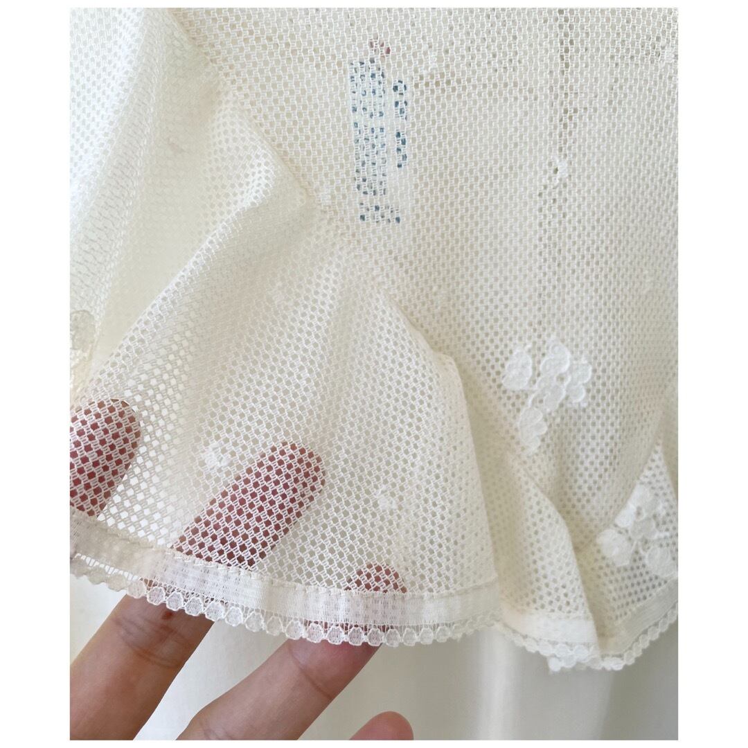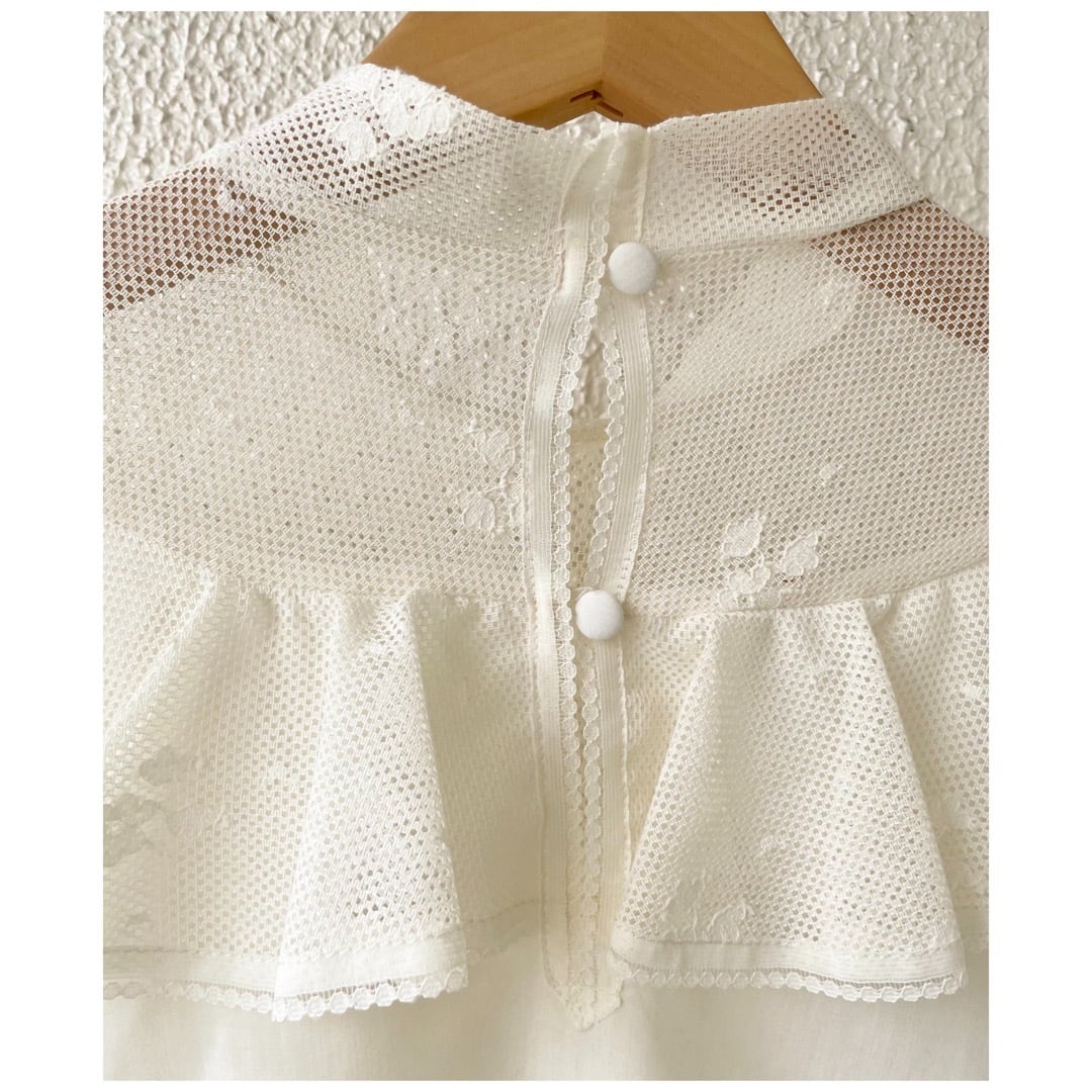 小花柄の刺繍が施されたメッシュ素材に、肩を覆うフリルデザインがロマンティックなブラウス。やわらかく上品なアイボリーカラーで、クラシカルさと甘さがミックスされた大人かわいい1枚です。シルエットはゆったりめ、フリルは後ろにも広がっているので、前後どちらから見ても様になります。