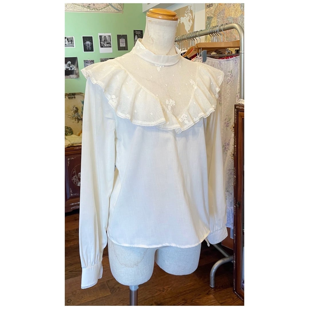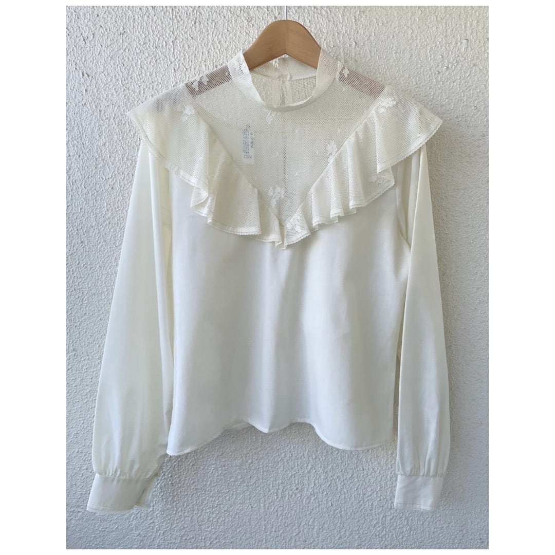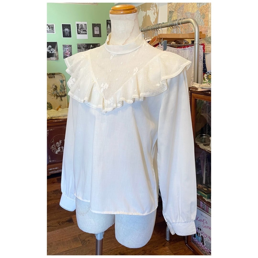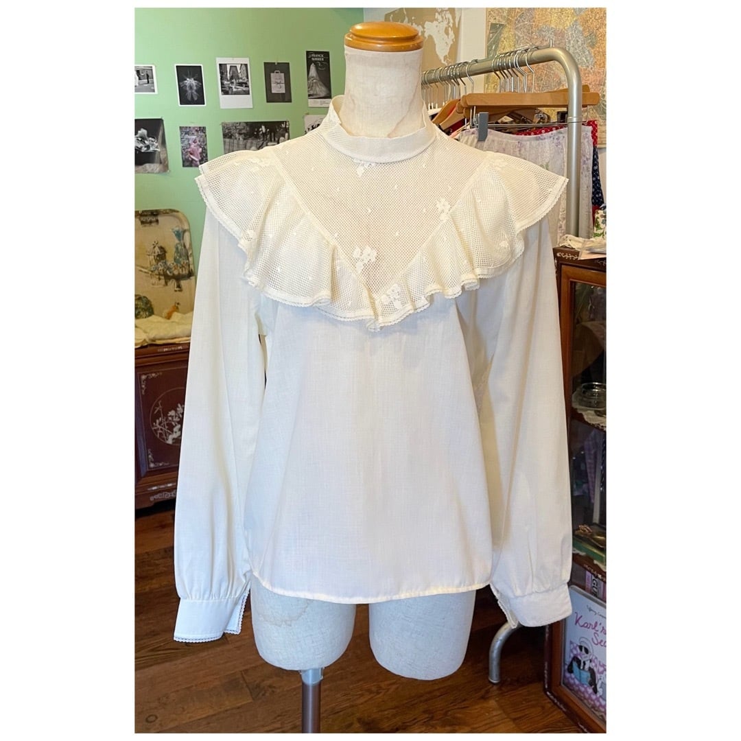 小花柄の刺繍が施されたメッシュ素材に、肩を覆うフリルデザインがロマンティックなブラウス。やわらかく上品なアイボリーカラーで、クラシカルさと甘さがミックスされた大人かわいい1枚です。シルエットはゆったりめ、フリルは後ろにも広がっているので、前後どちらから見ても様になります。