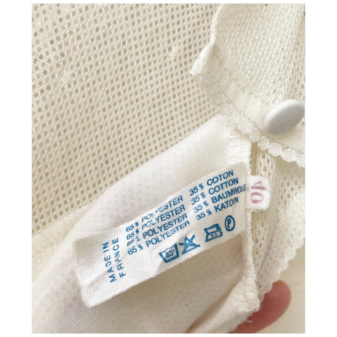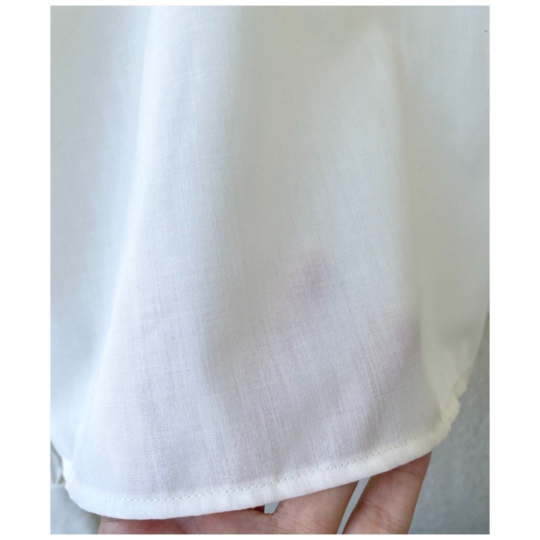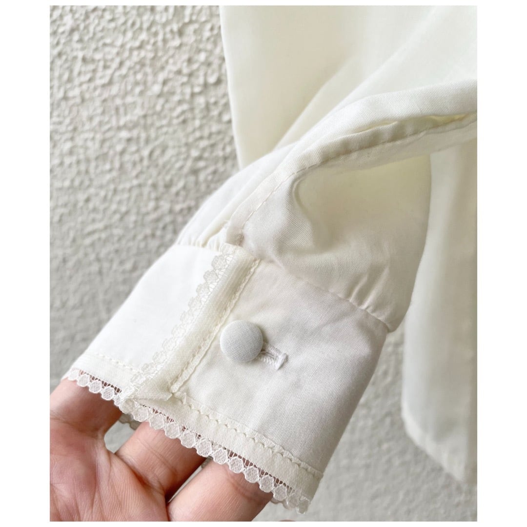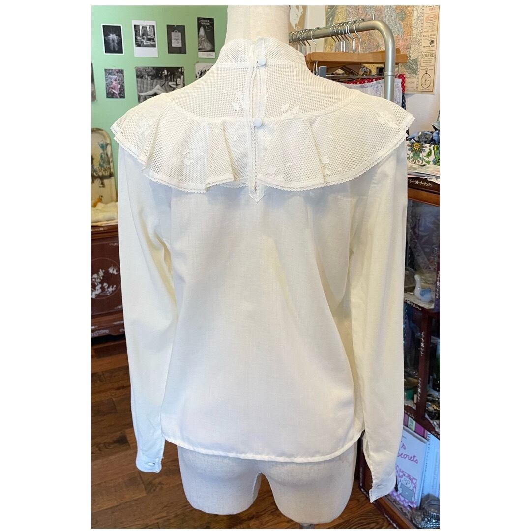 小花柄の刺繍が施されたメッシュ素材に、肩を覆うフリルデザインがロマンティックなブラウス。やわらかく上品なアイボリーカラーで、クラシカルさと甘さがミックスされた大人かわいい1枚です。シルエットはゆったりめ、フリルは後ろにも広がっているので、前後どちらから見ても様になります。