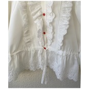 フリルデザインが華やかなホワイトブラウス。裾にもたっぷり入ったカットワークデザインに、オールホワイトの中の、小さな赤いボタンのアクセントも愛らしく、ロマンティックムード満載な主役級の1枚です。ウエスト切り替えのペプラムシルエットで、軽く絞るとよりフェミニンなラインに◎