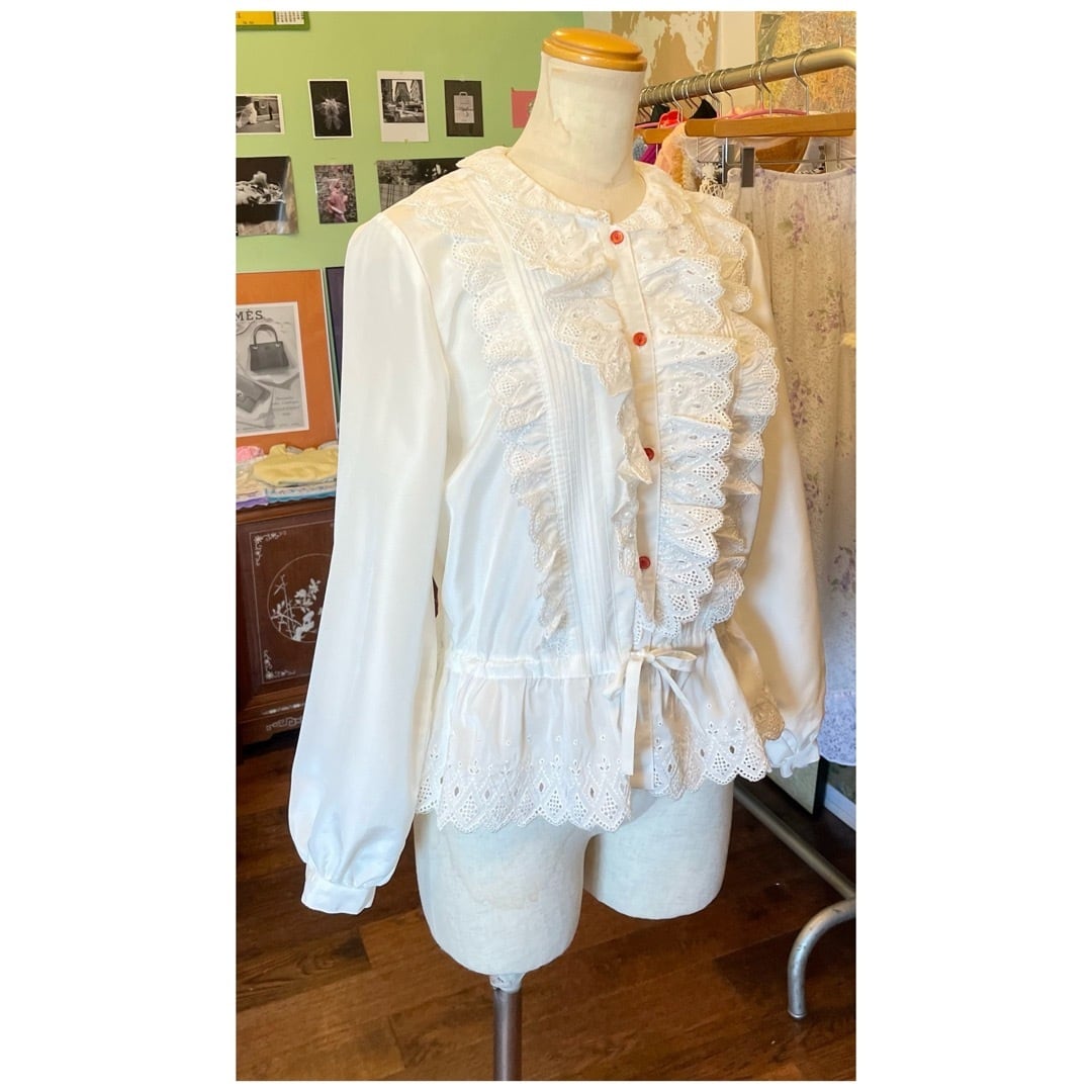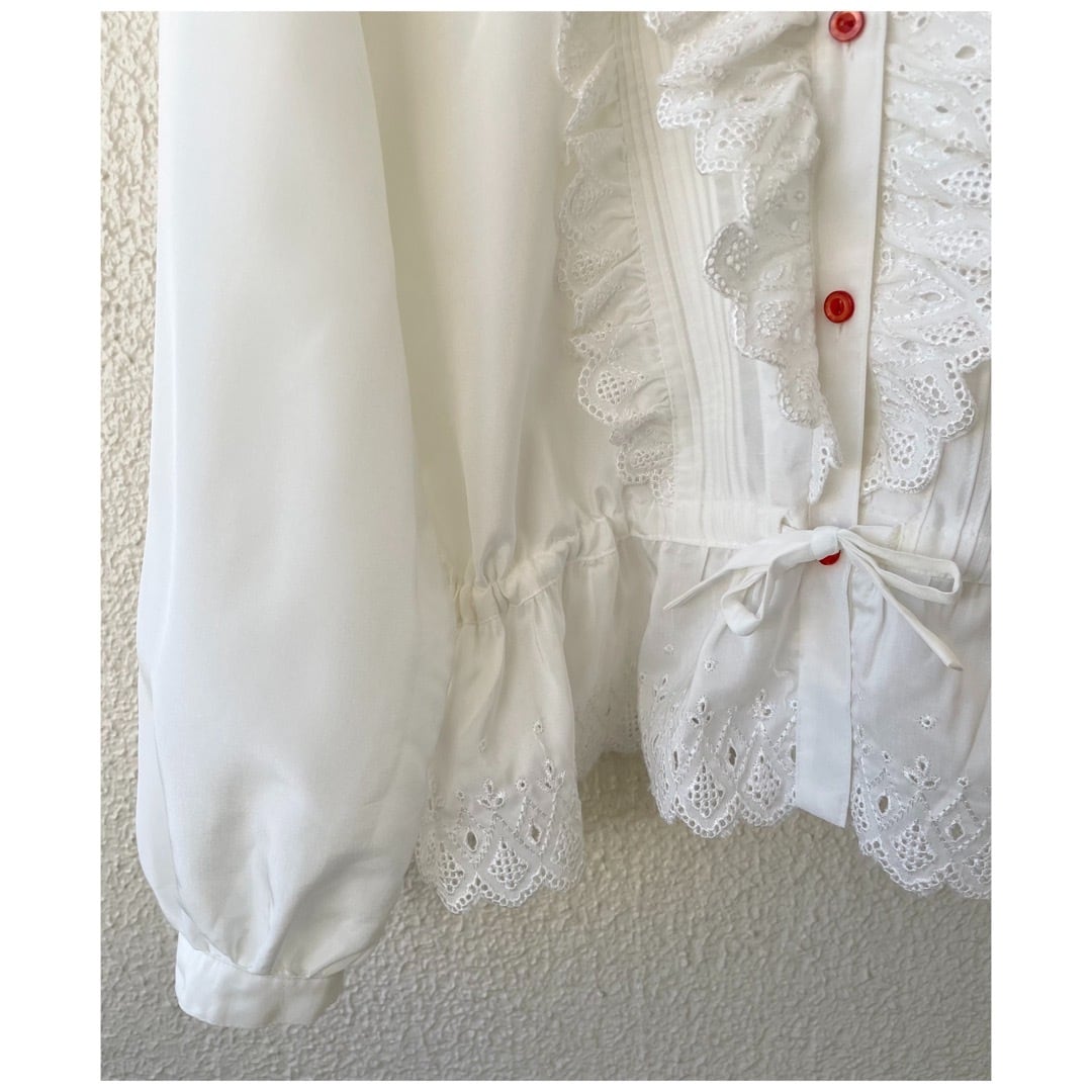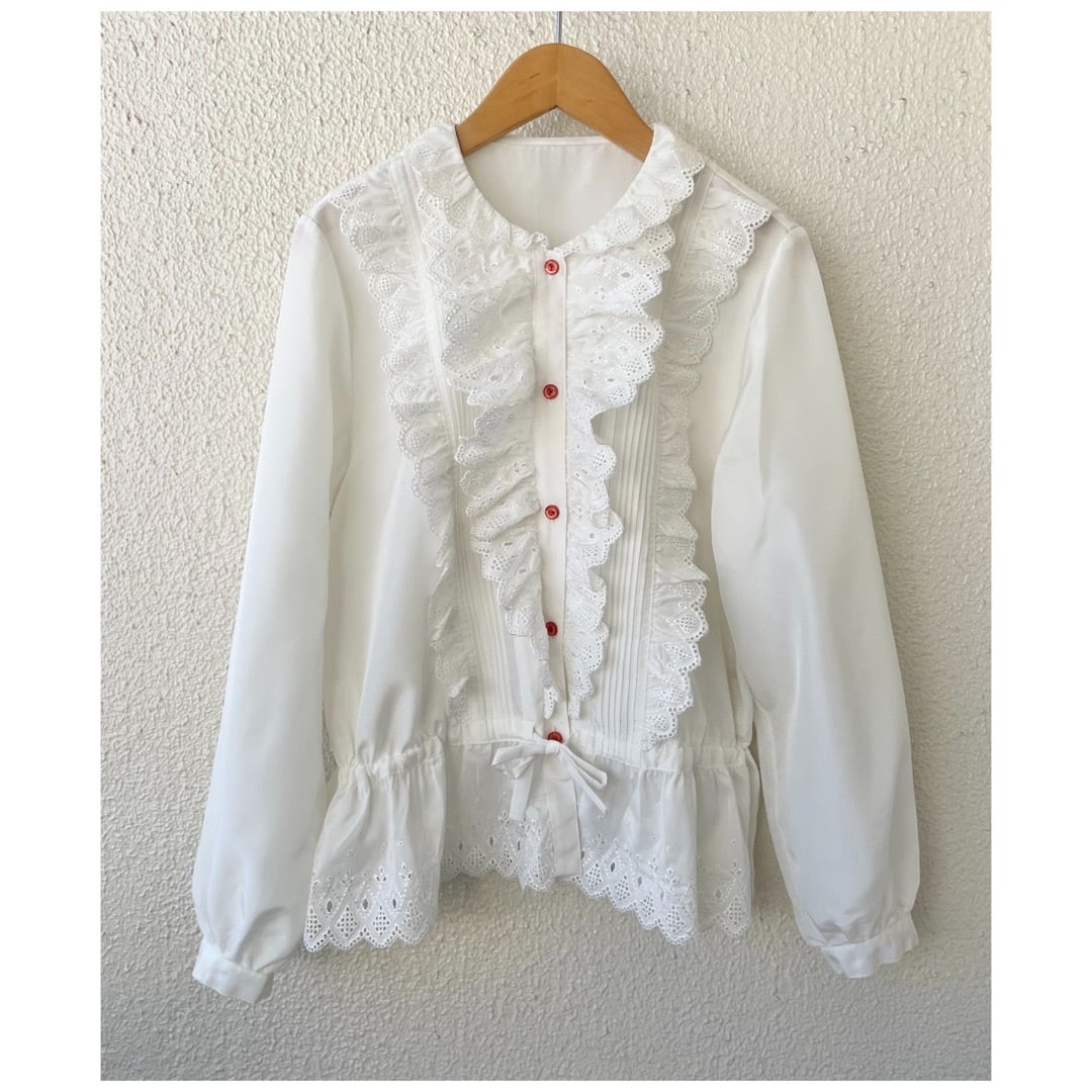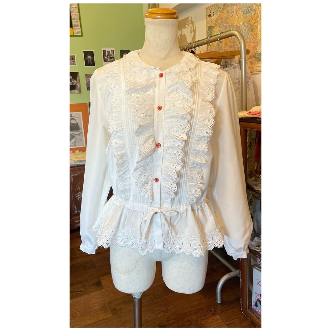 ヴィンテージ ブラウス フリル レース カットワーク ペプラム 日本製 ホワイト