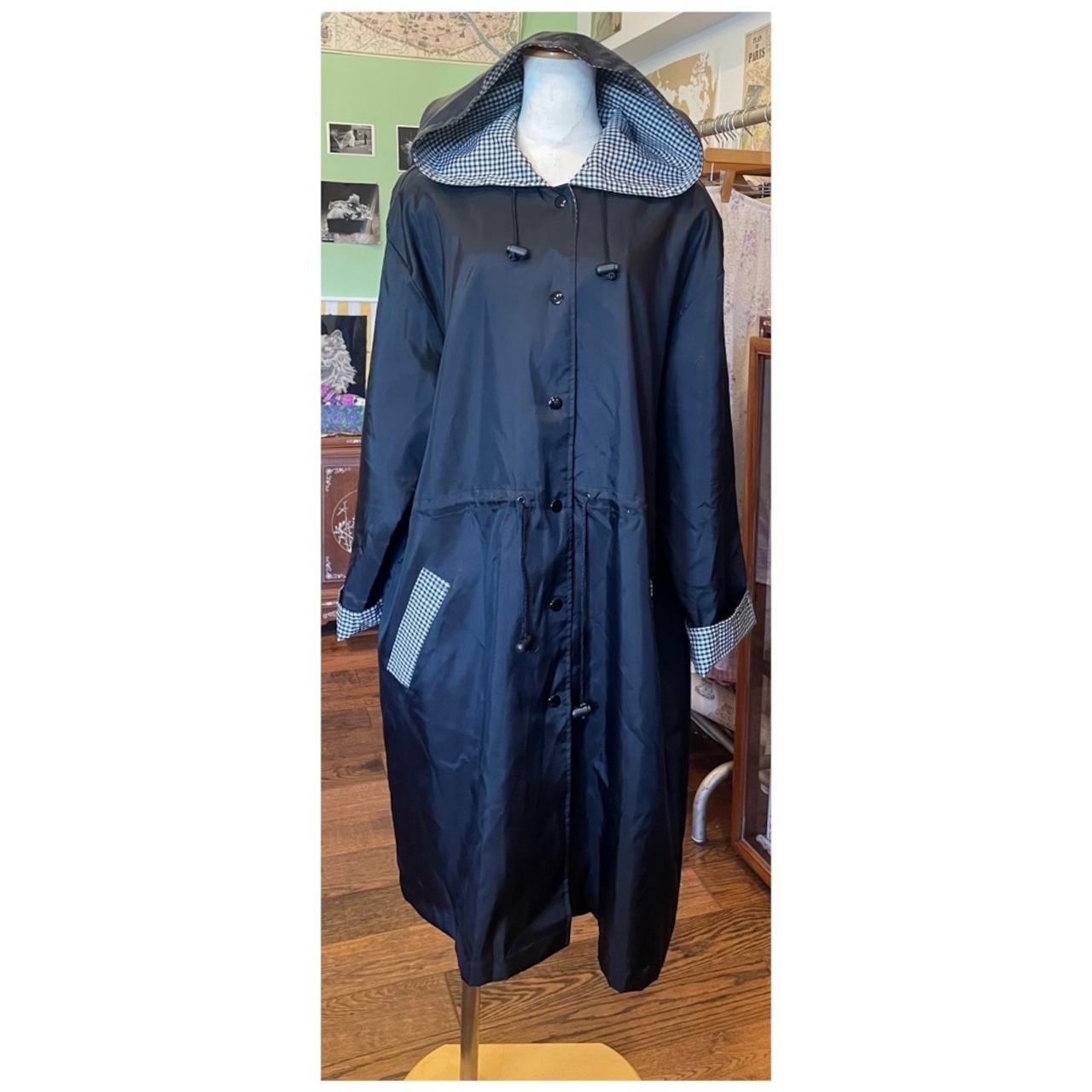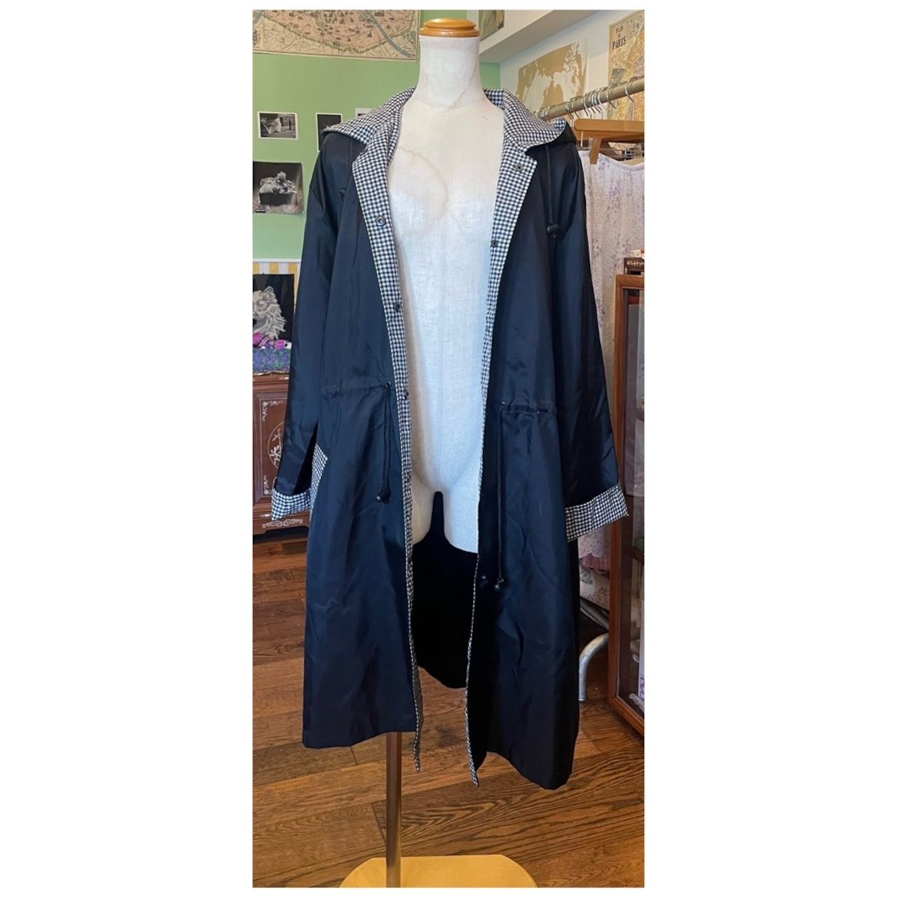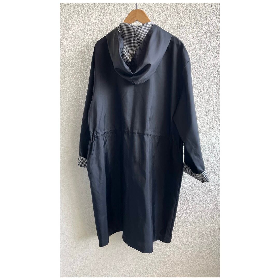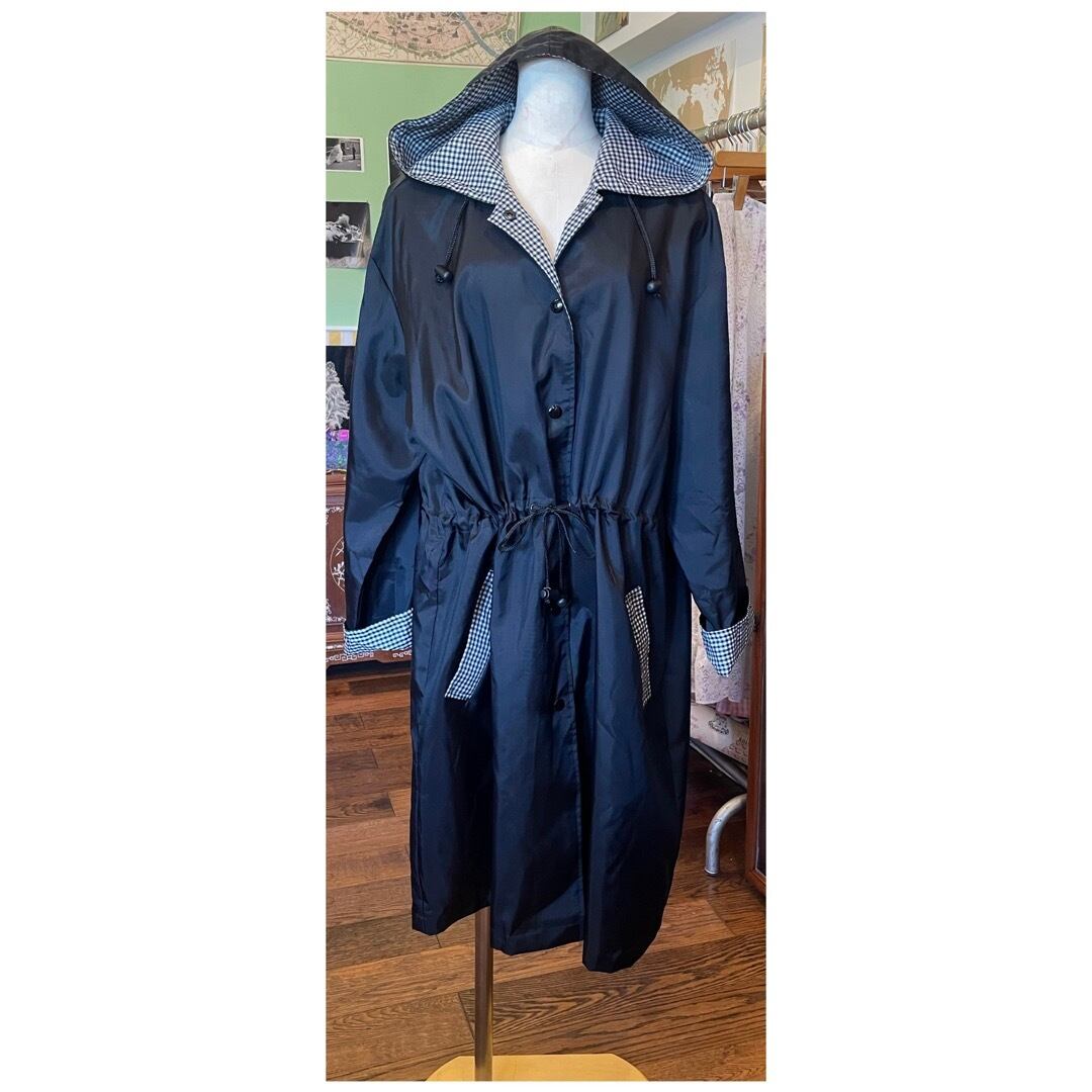 ヴィンテージ ナイロンコート ライトアウター フーディー ロールアップ袖 撥水 ギンガムチェック ブラック
