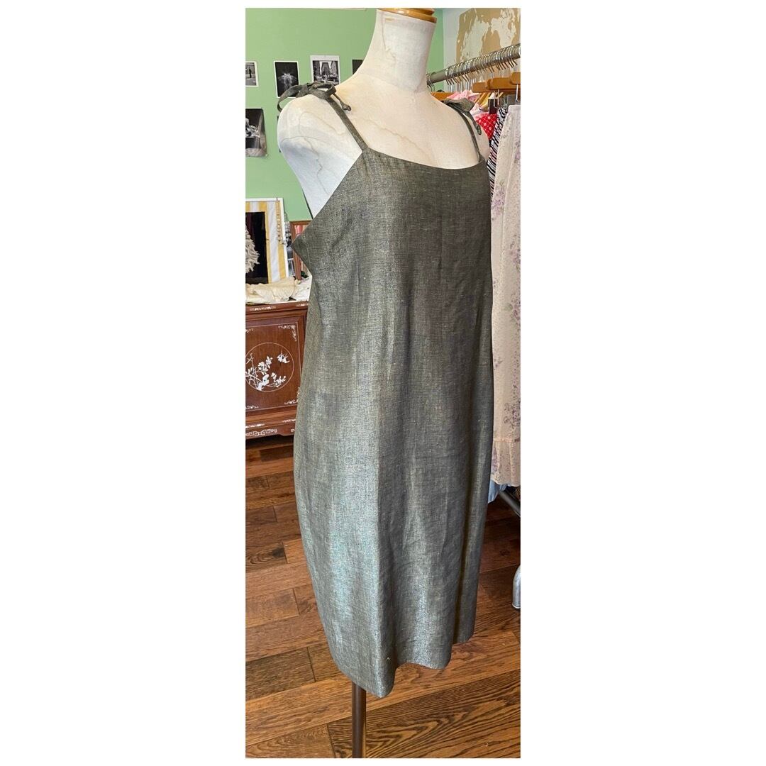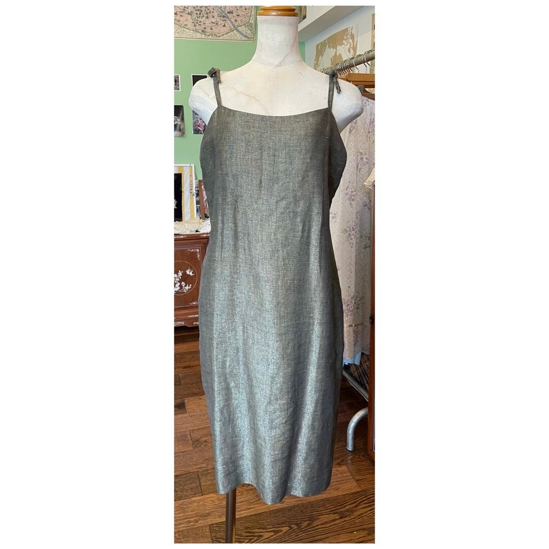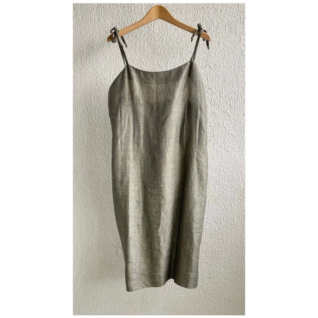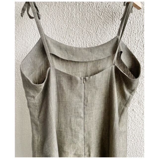 フランス買付 ヴィンテージ ワンピース サマードレス キャミソール 肩リボン 麻 オリーブグレー 送料無料