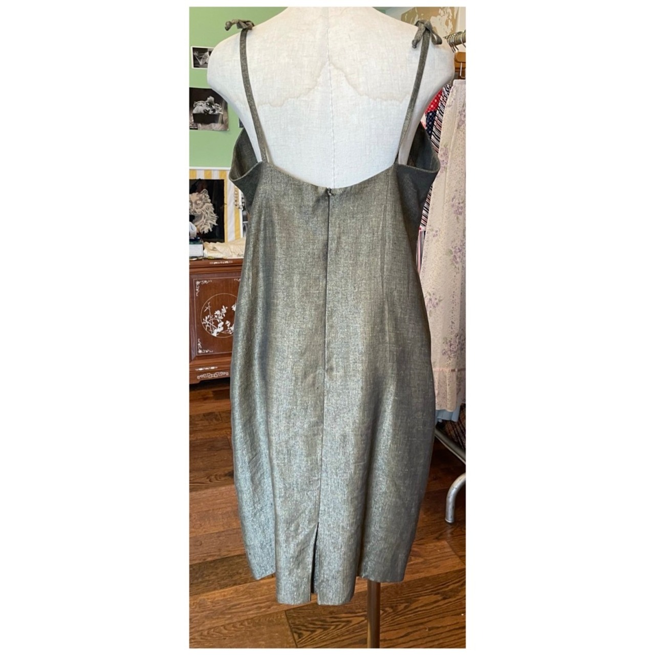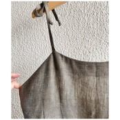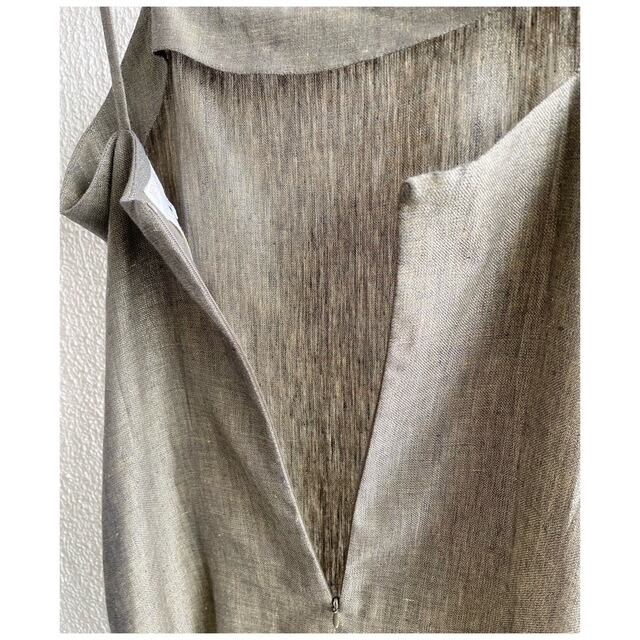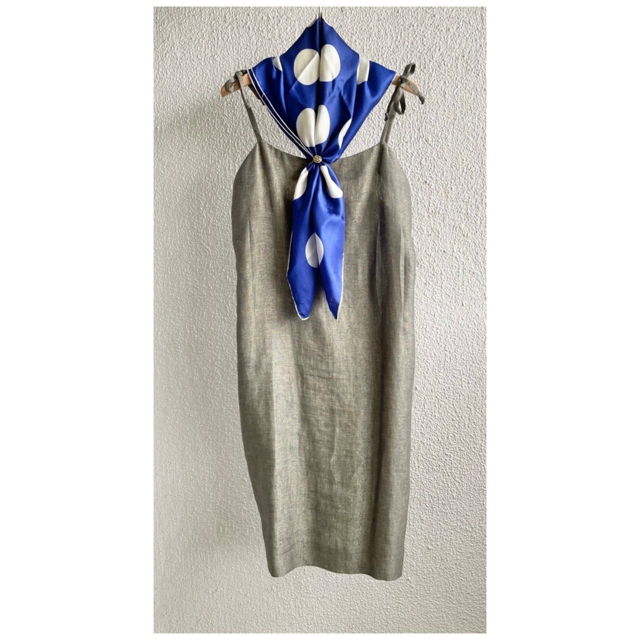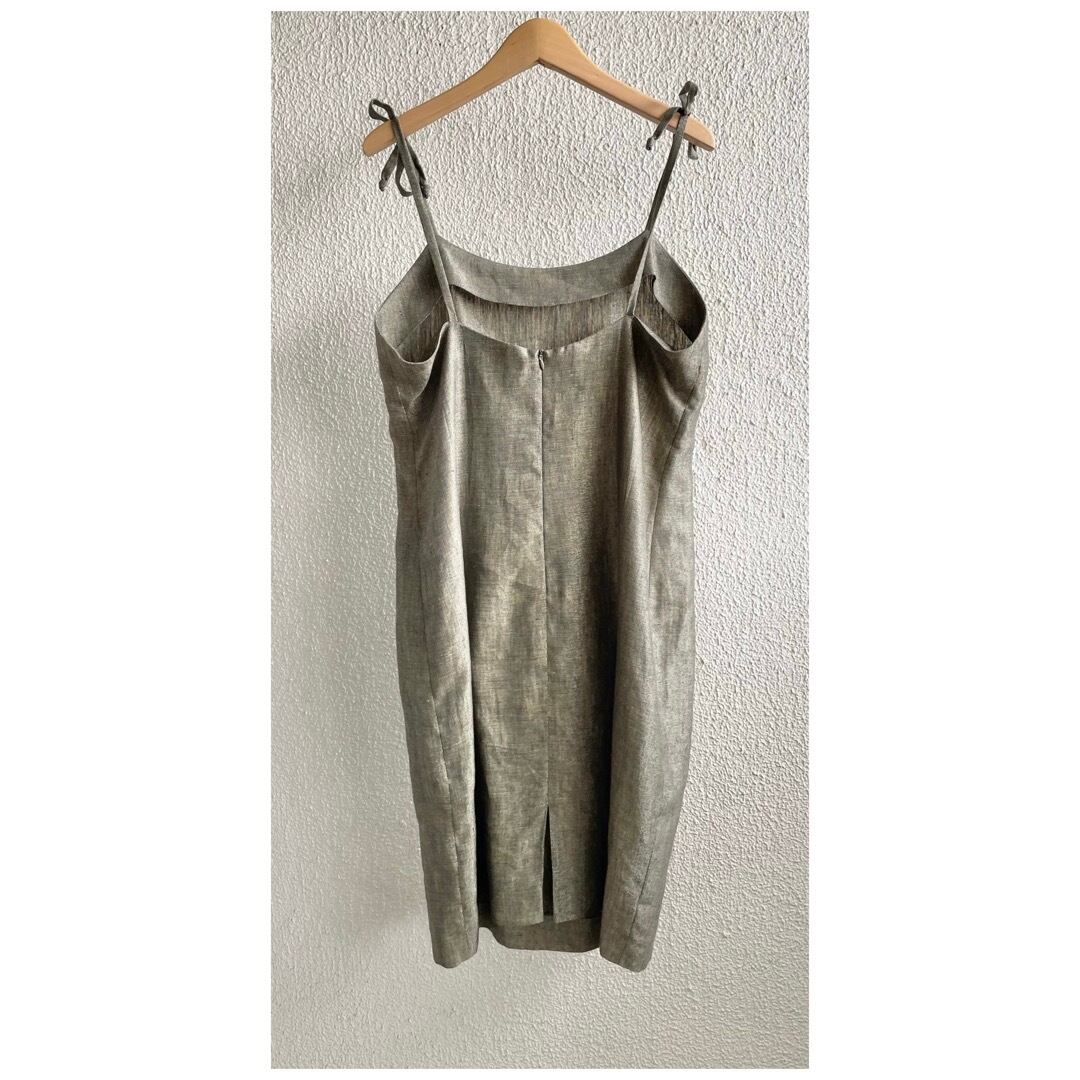 フランス買付 ヴィンテージ ワンピース サマードレス キャミソール 肩リボン 麻 オリーブグレー 送料無料