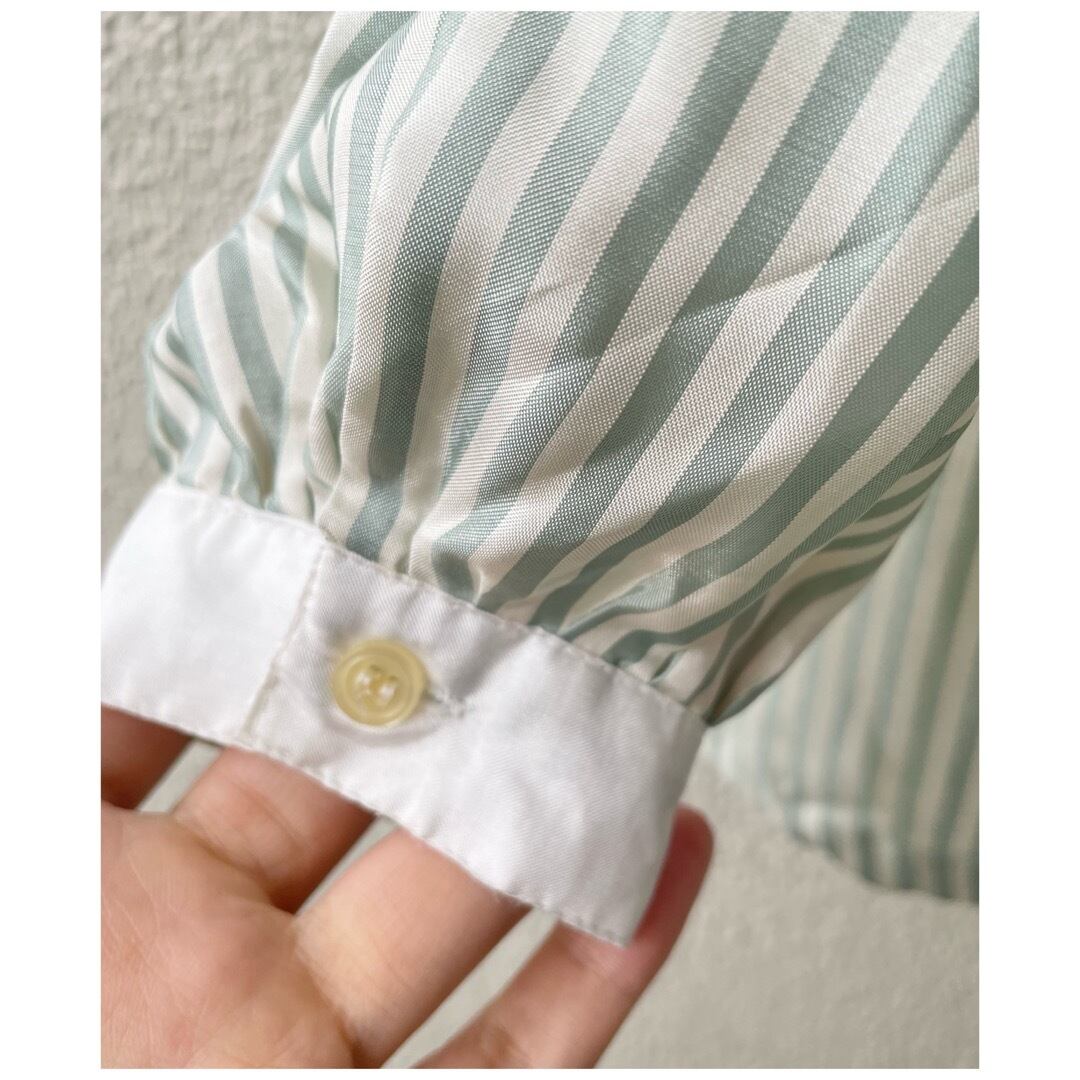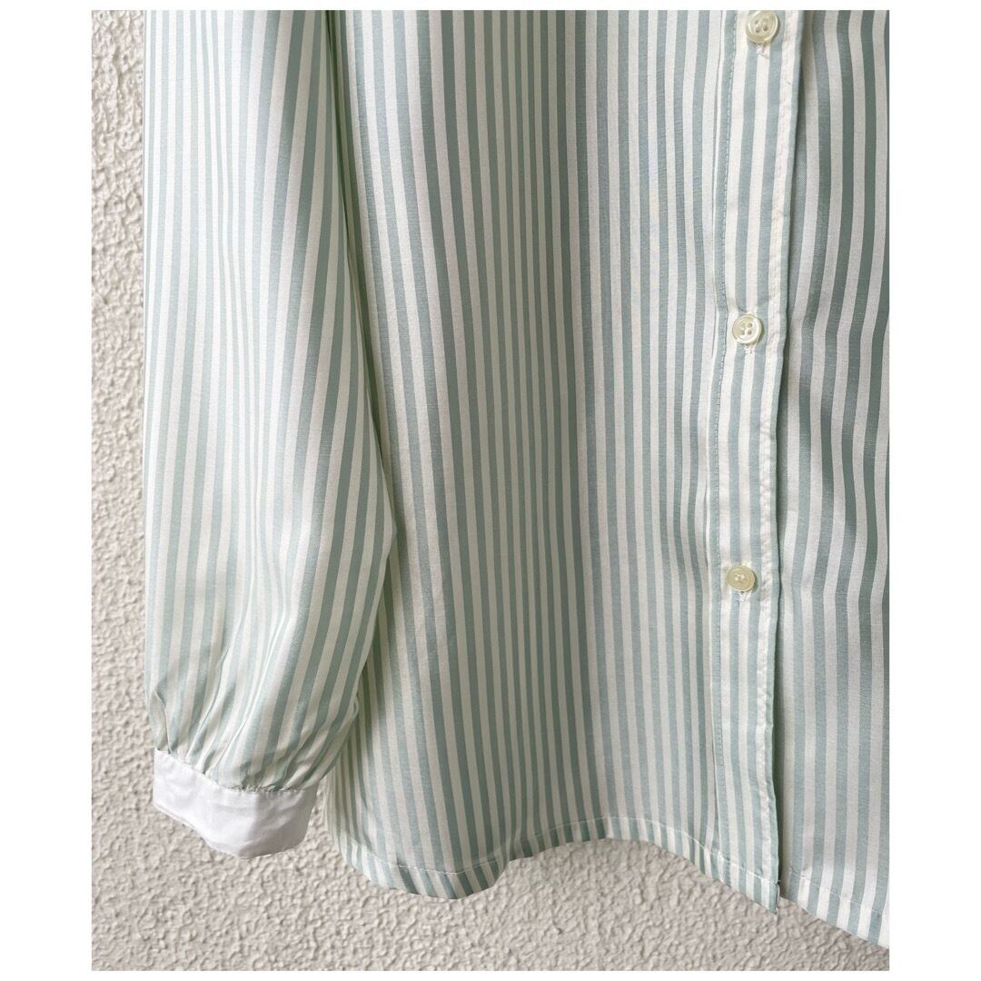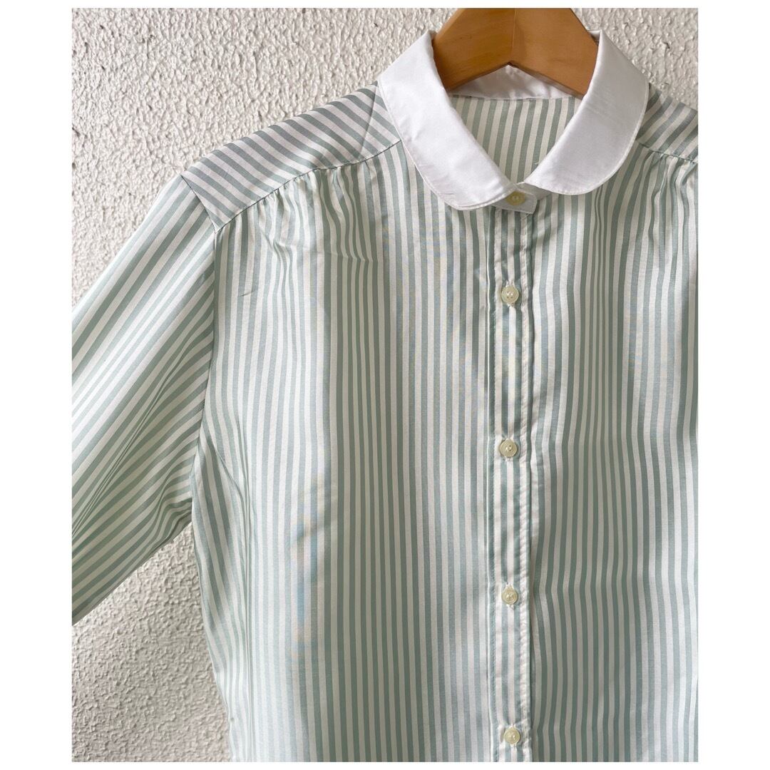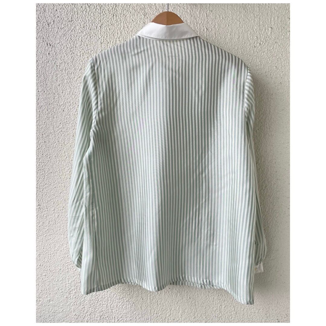 ヴィンテージ ブラウス 丸襟 白襟 ストライプ 日本製 光沢 ミントグリーン