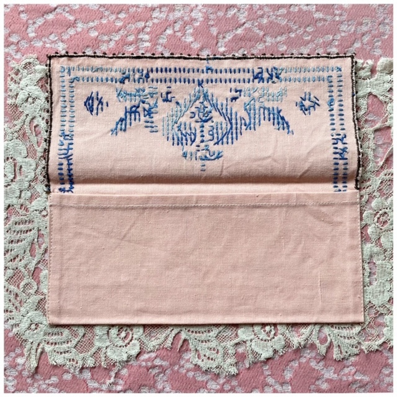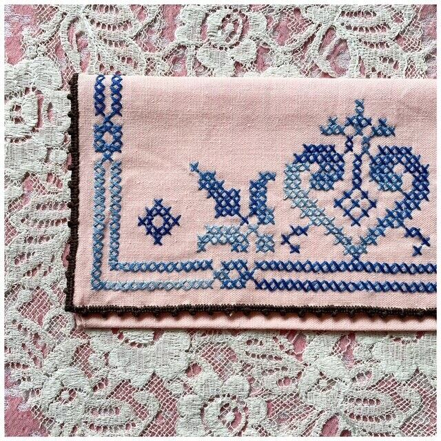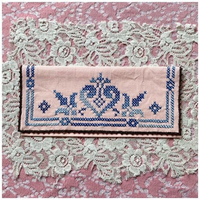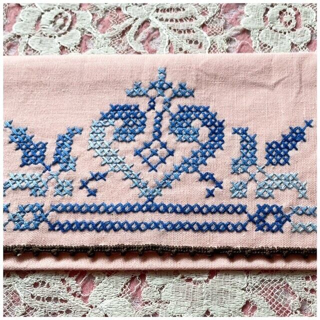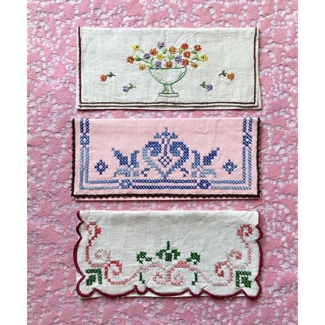 フランス買付 ヴィンテージ カトラリーケース 刺繍ポーチ クロスステッチ ♡ ハート サーモンピンク