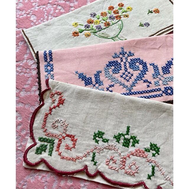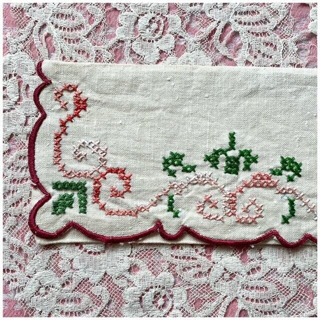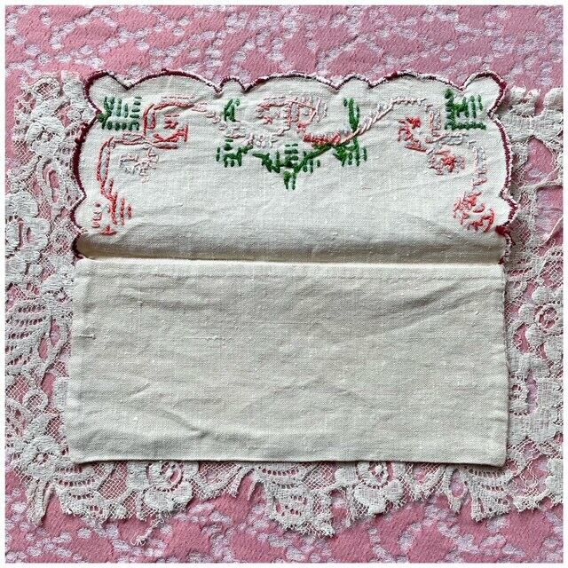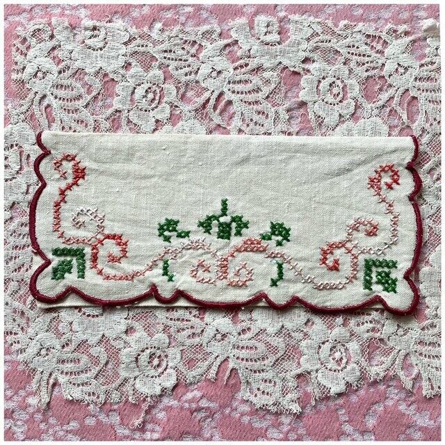 フランス ヴィンテージ カトラリーケース 刺繍ポーチ クロスステッチ スカラップ エクリュ バーガンディ