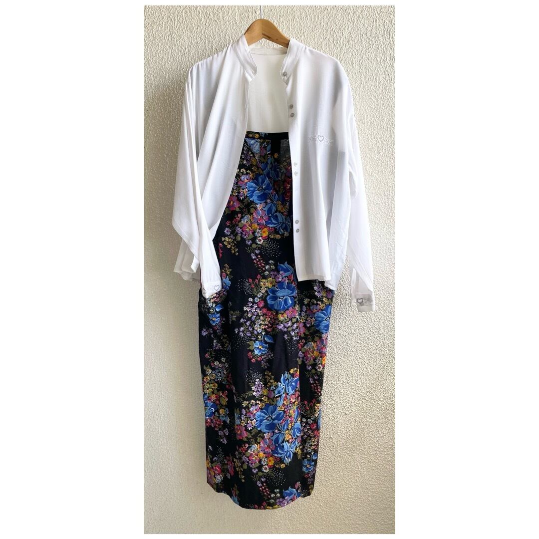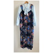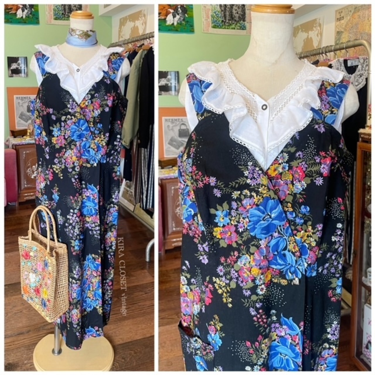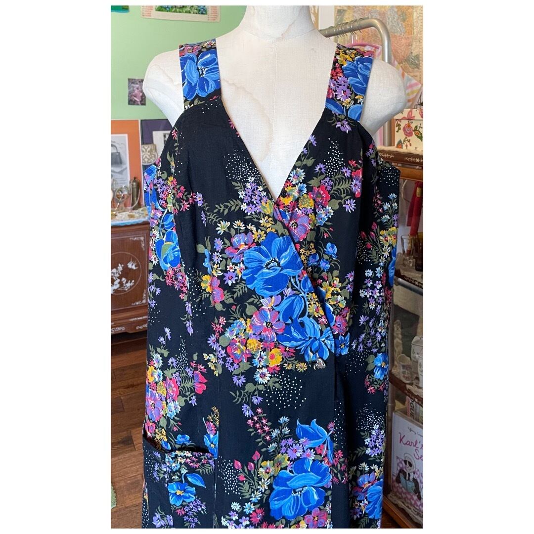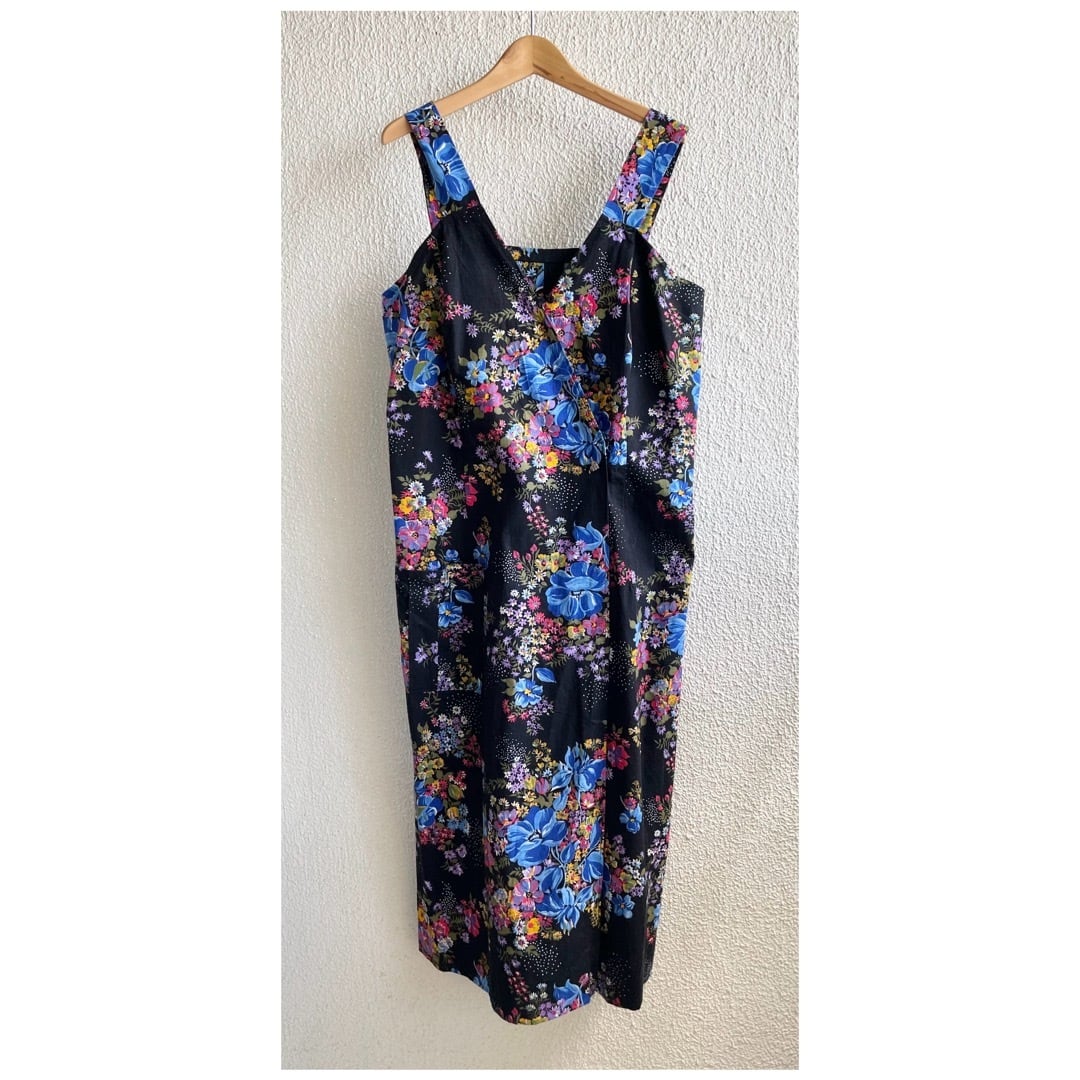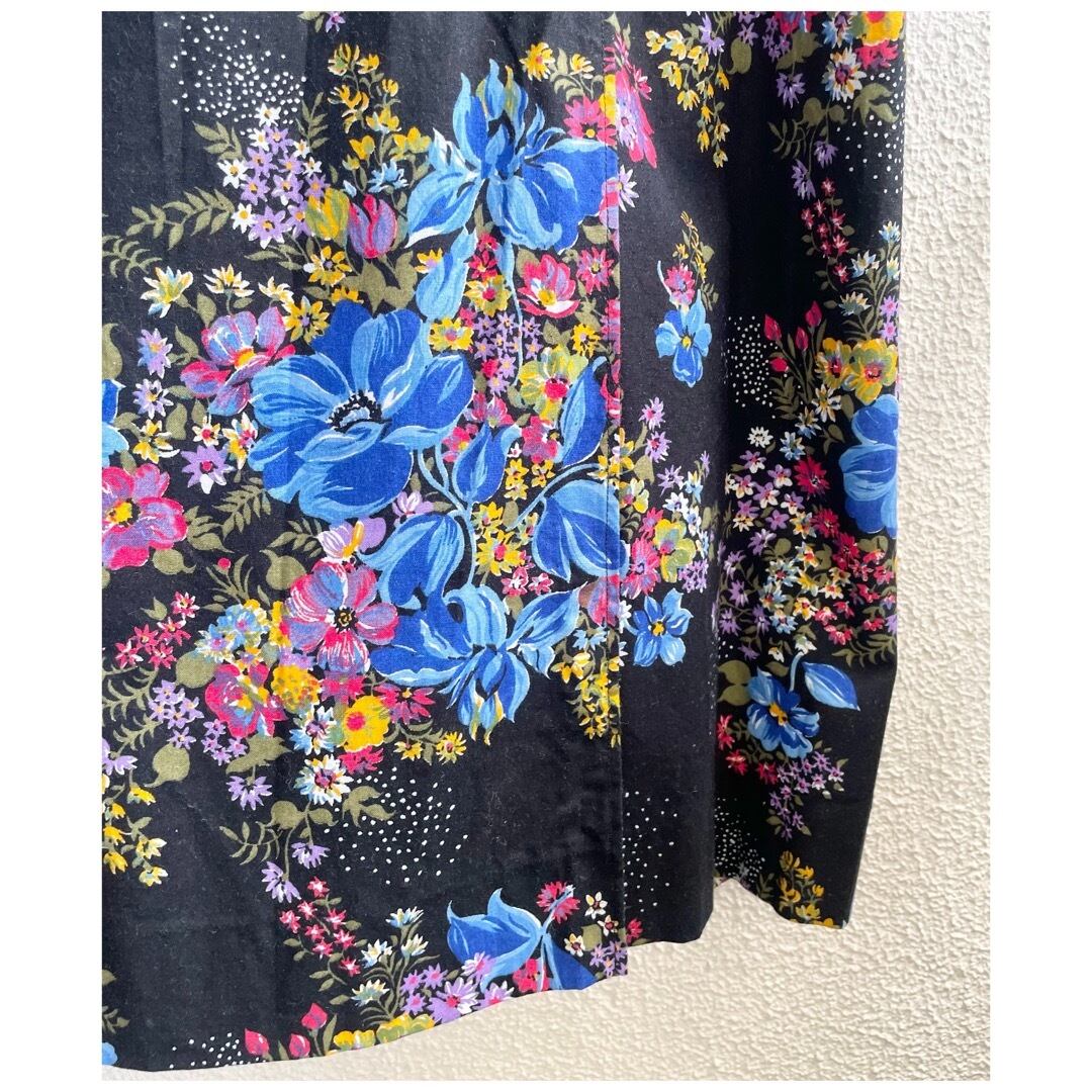フランス買付 ヴィンテージ ワンピース エプロンドレス コットン ハートボタン 花柄 ブラックベース