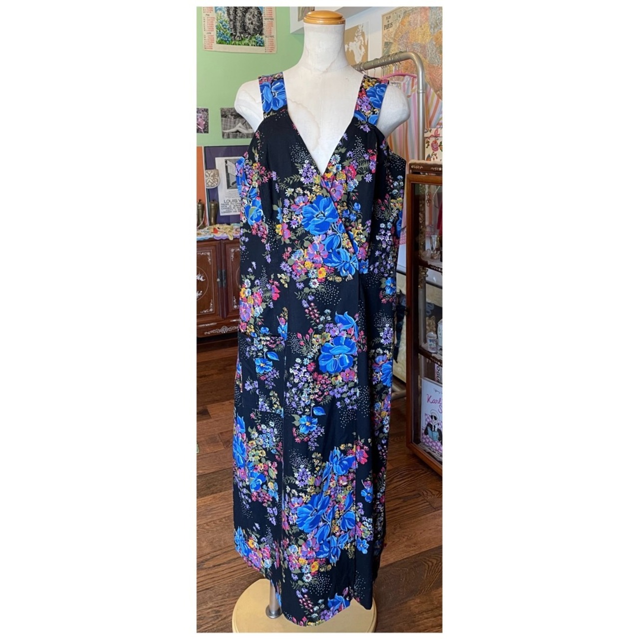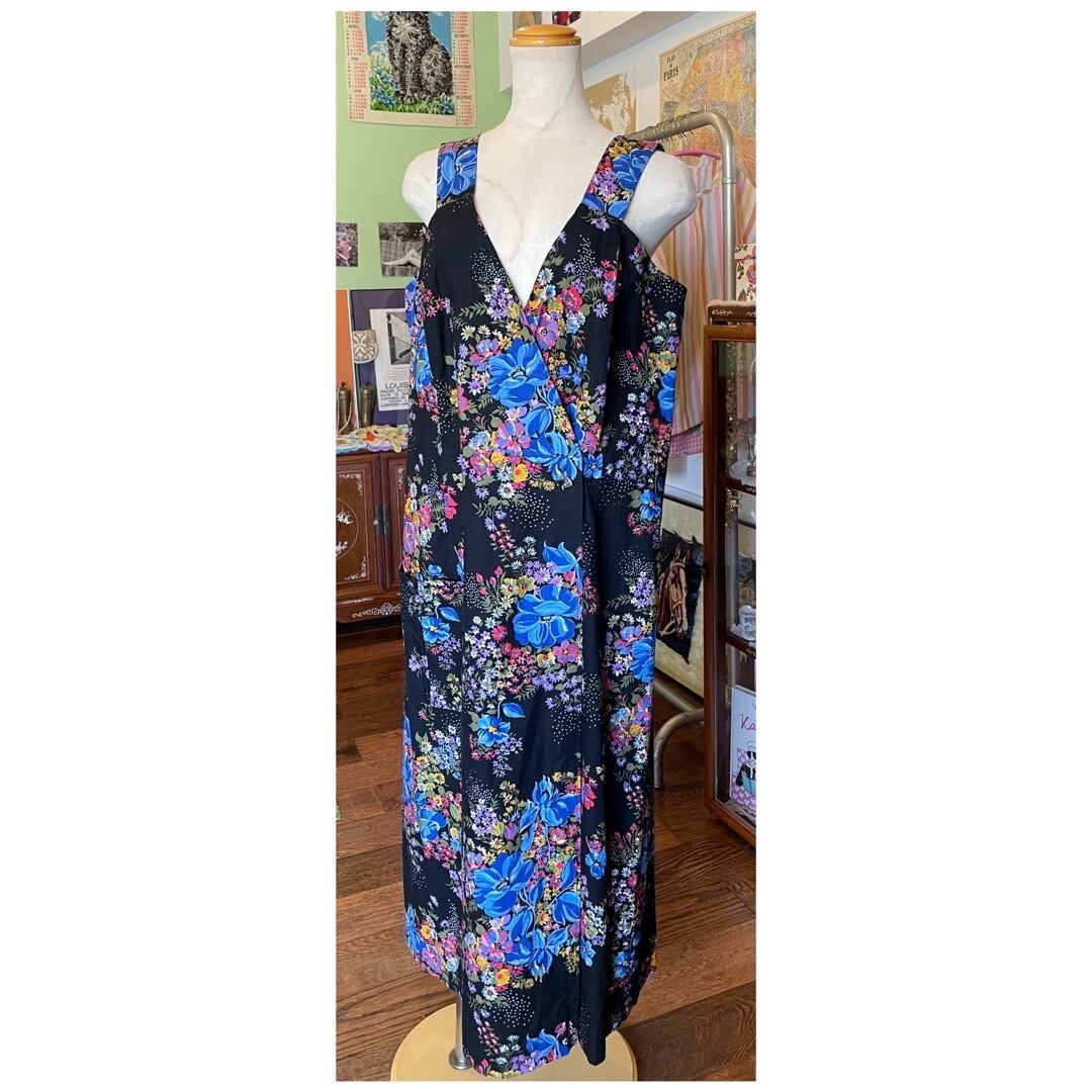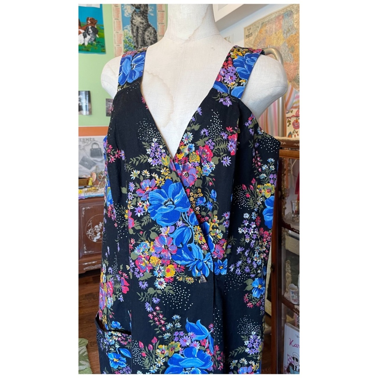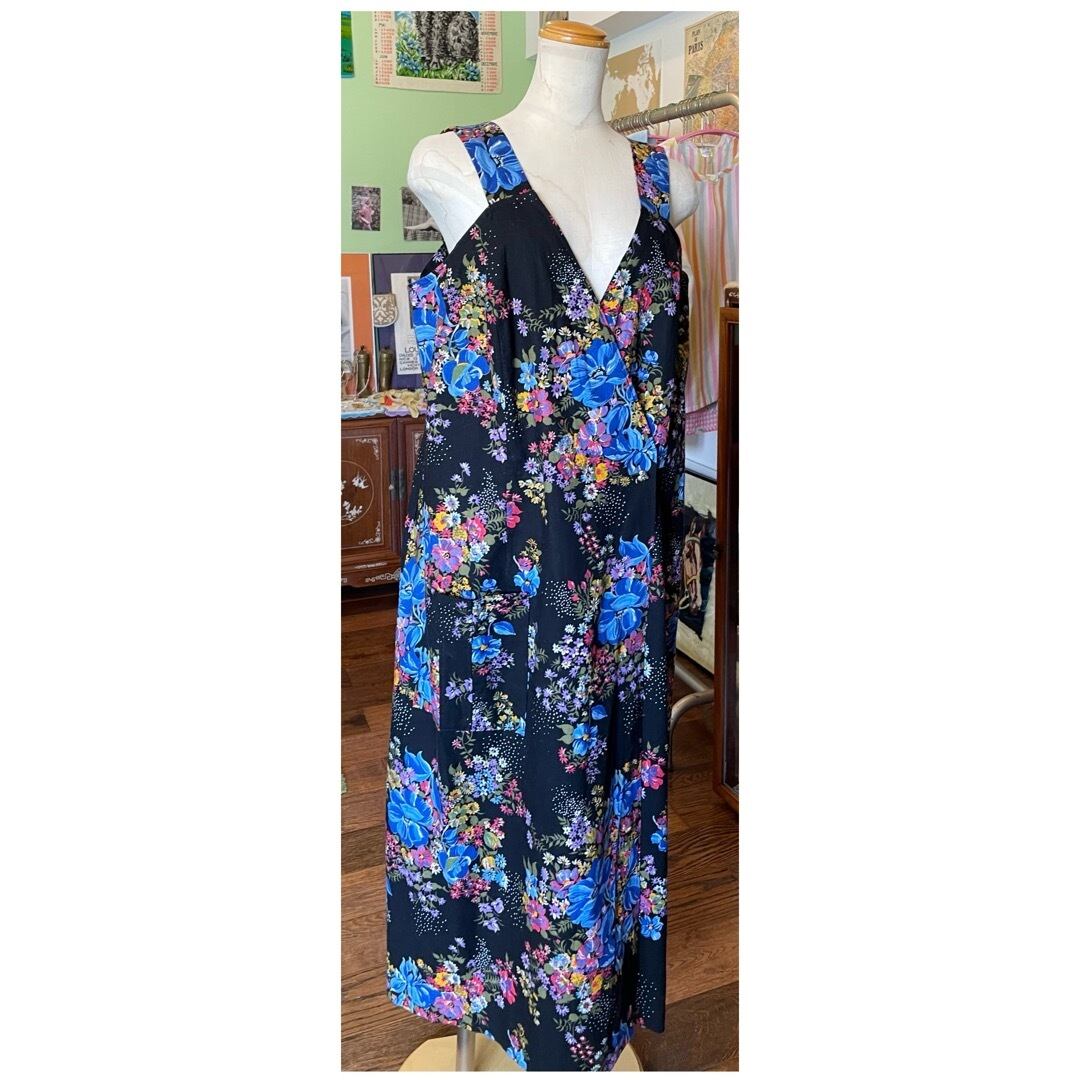 フランス買付 ヴィンテージ ワンピース エプロンドレス コットン ハートボタン 花柄 ブラックベース
