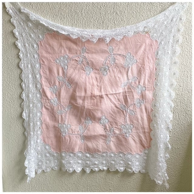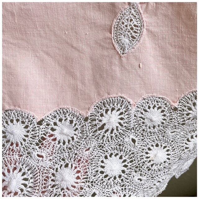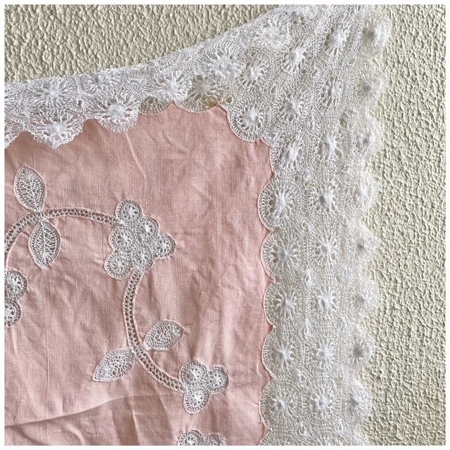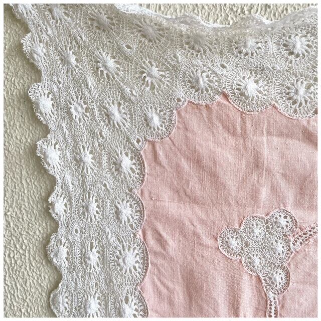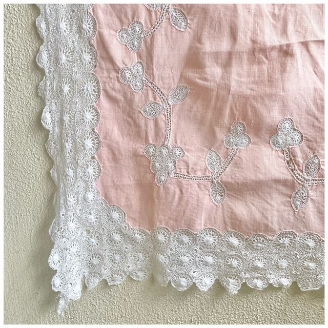 フランス買付 ヴィンテージ テーブルクロス カバークロス レースワーク 刺繍 クロッシェ スカラップ サーモンピンク