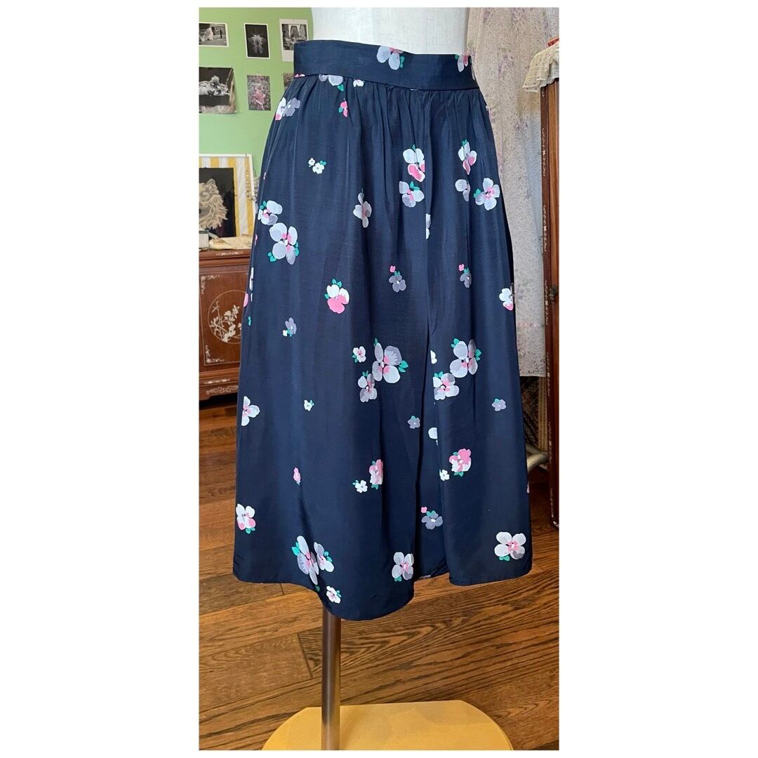 フランス買付 ヴィンテージ フレアスカート ボックスプリーツ 花柄 ネイビー