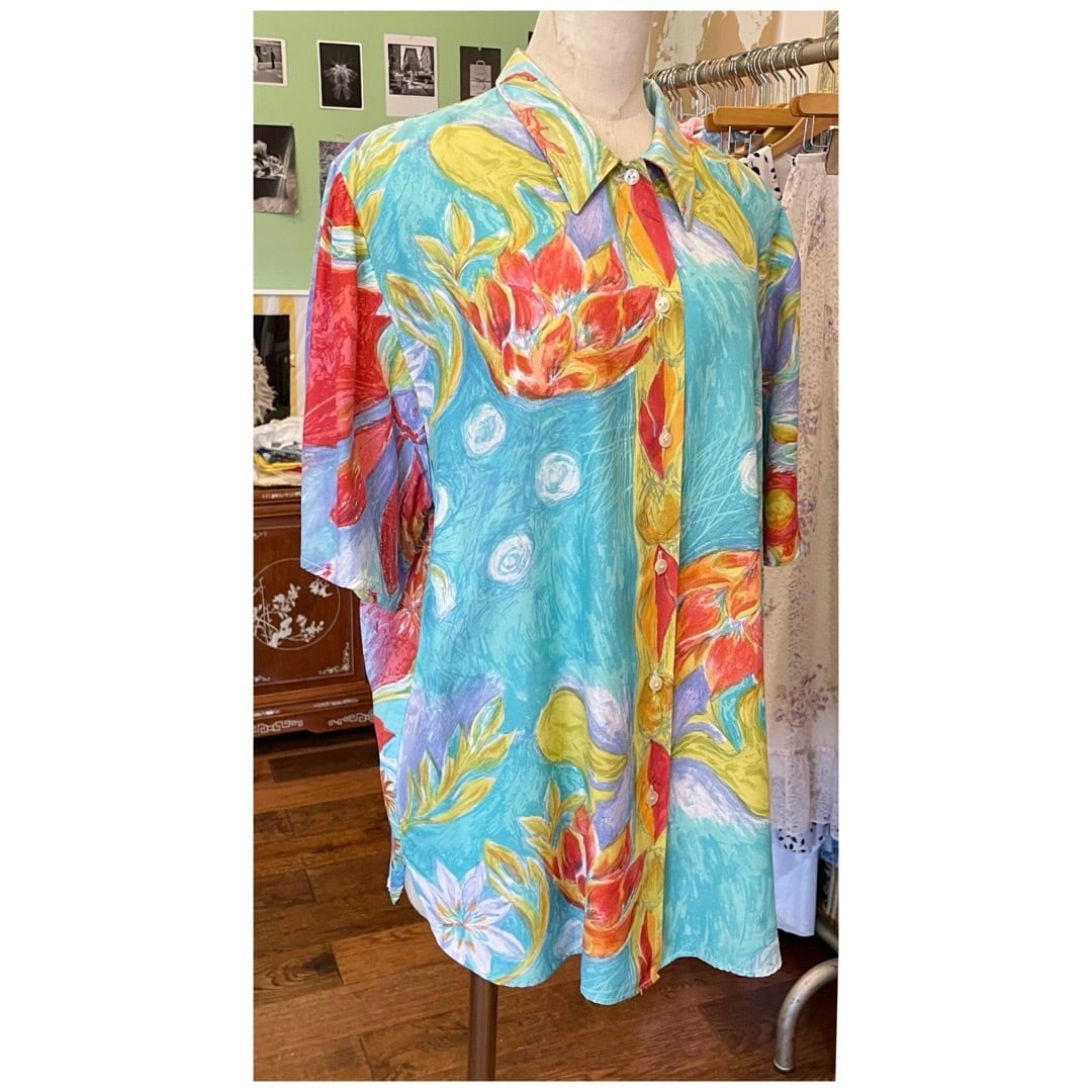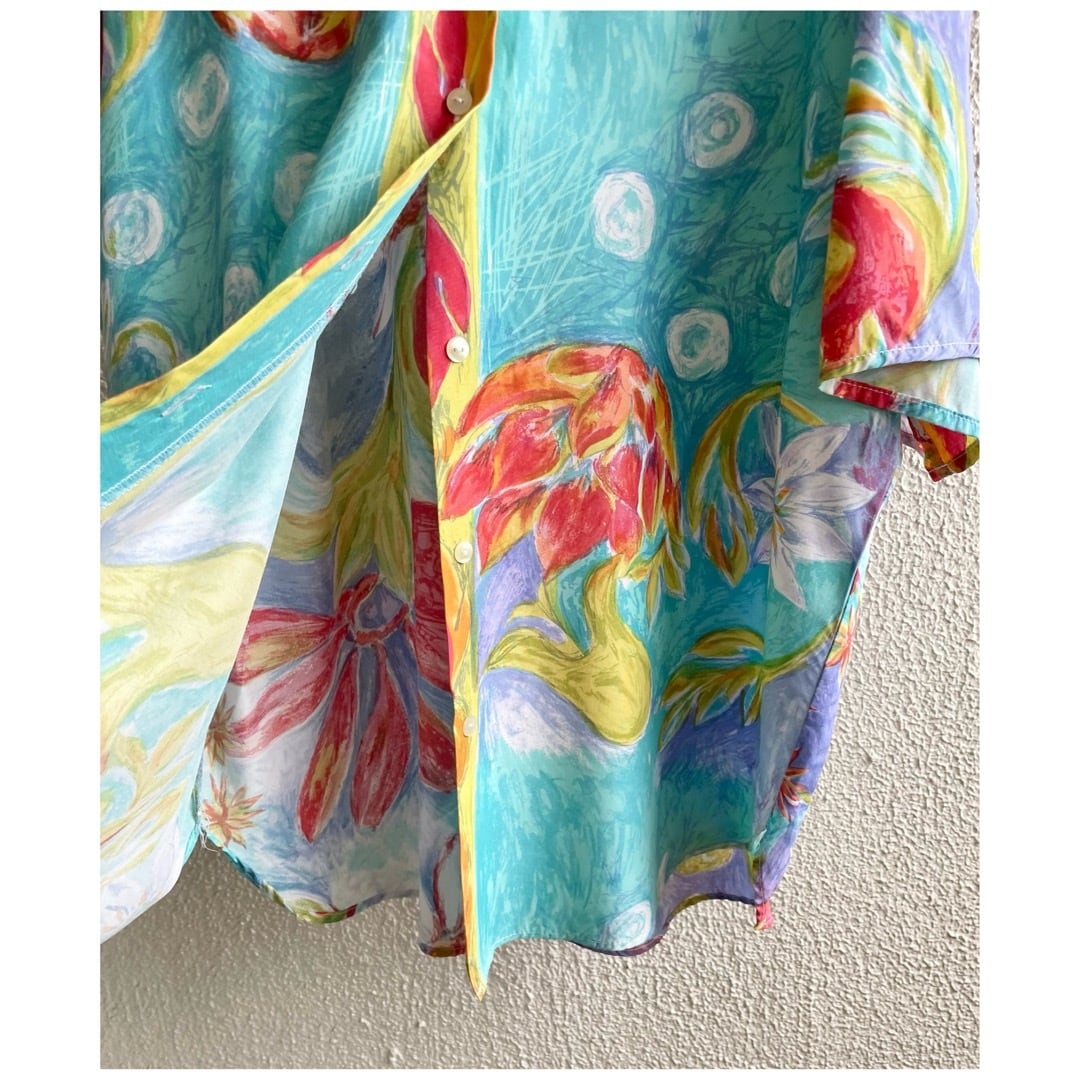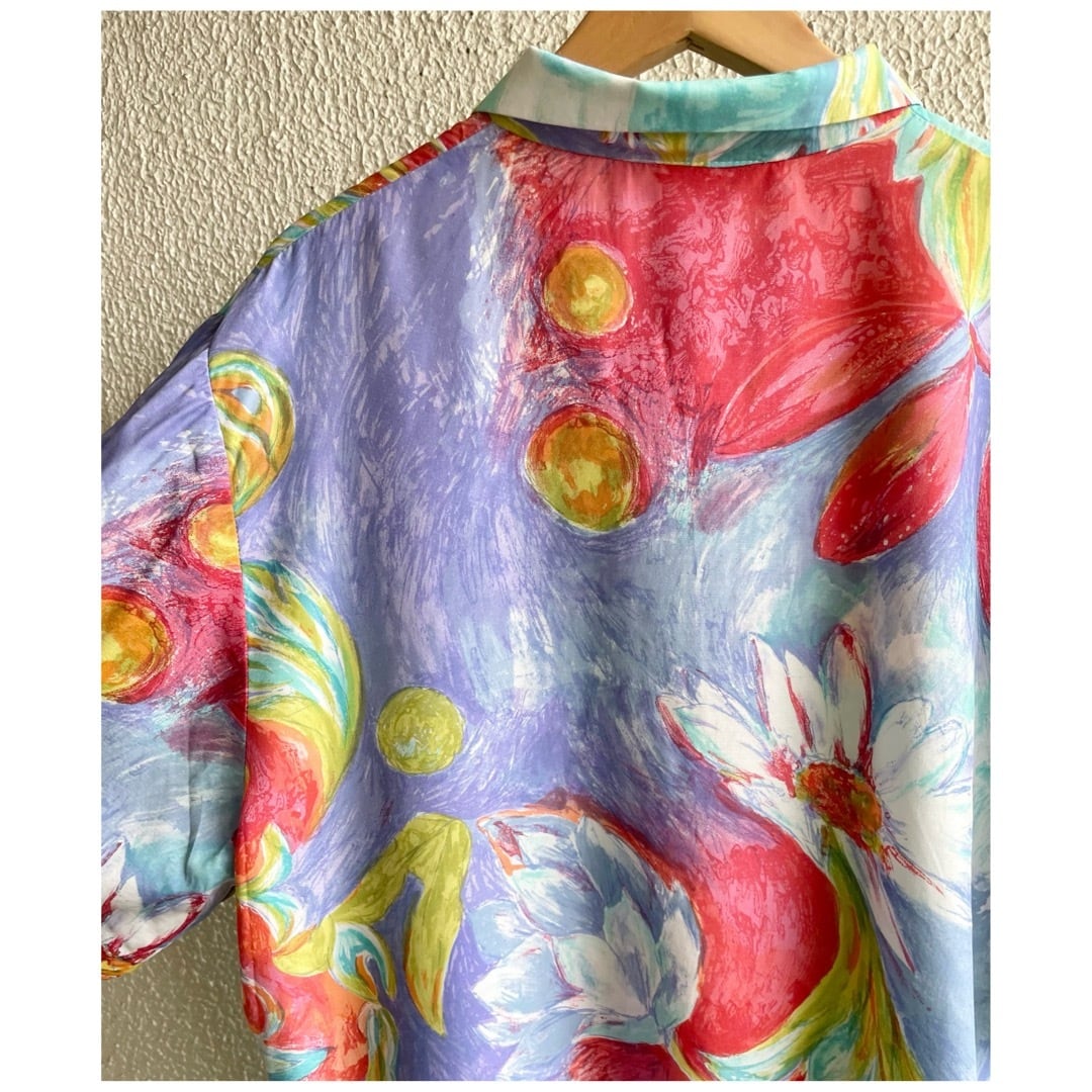 フランス買付 ヴィンテージ サマーブラウス 柄シャツ 水彩画 フラワープリント バイカラー アクアブルー パープル