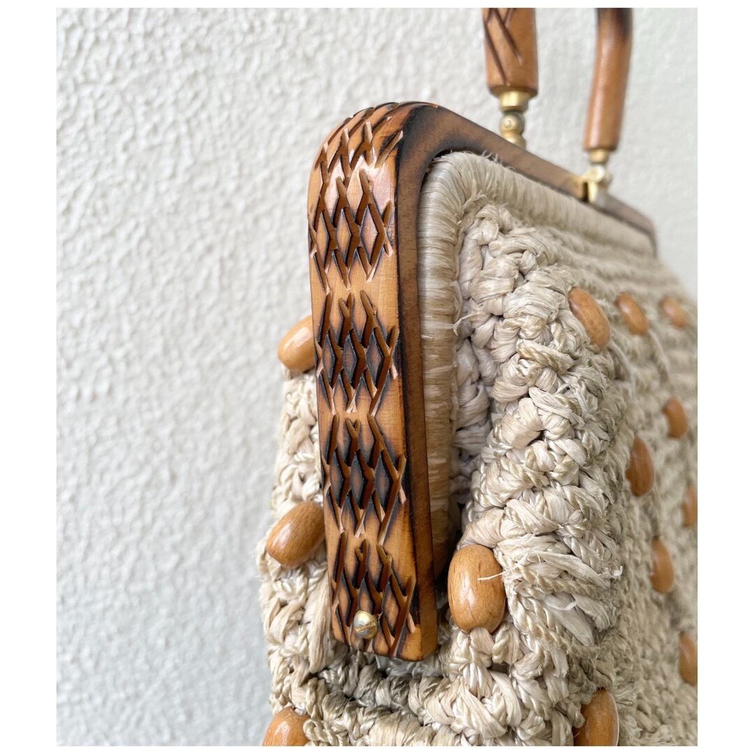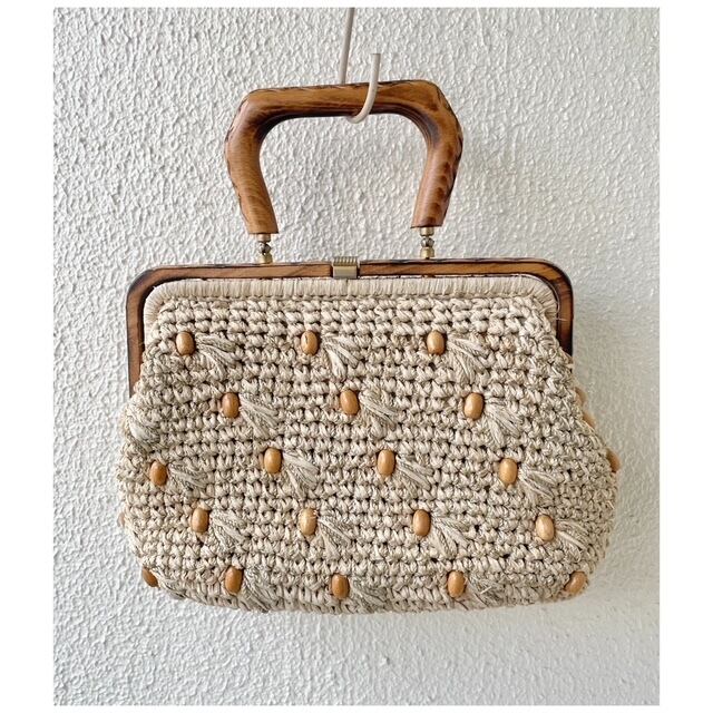 フランス ヴィンテージ サマーバッグ ハンドバッグ ウッドハンドル ウッドビーズ ベージュ