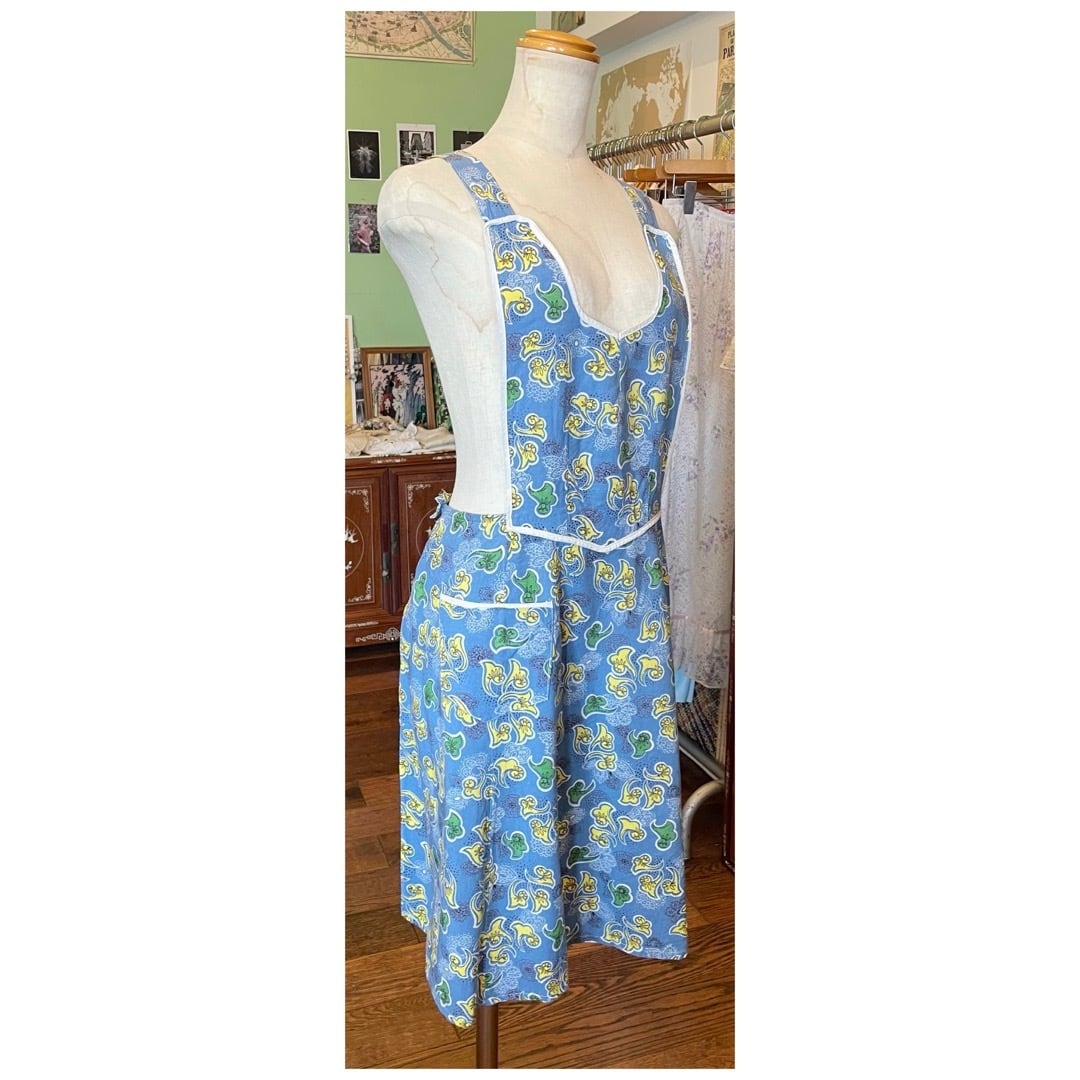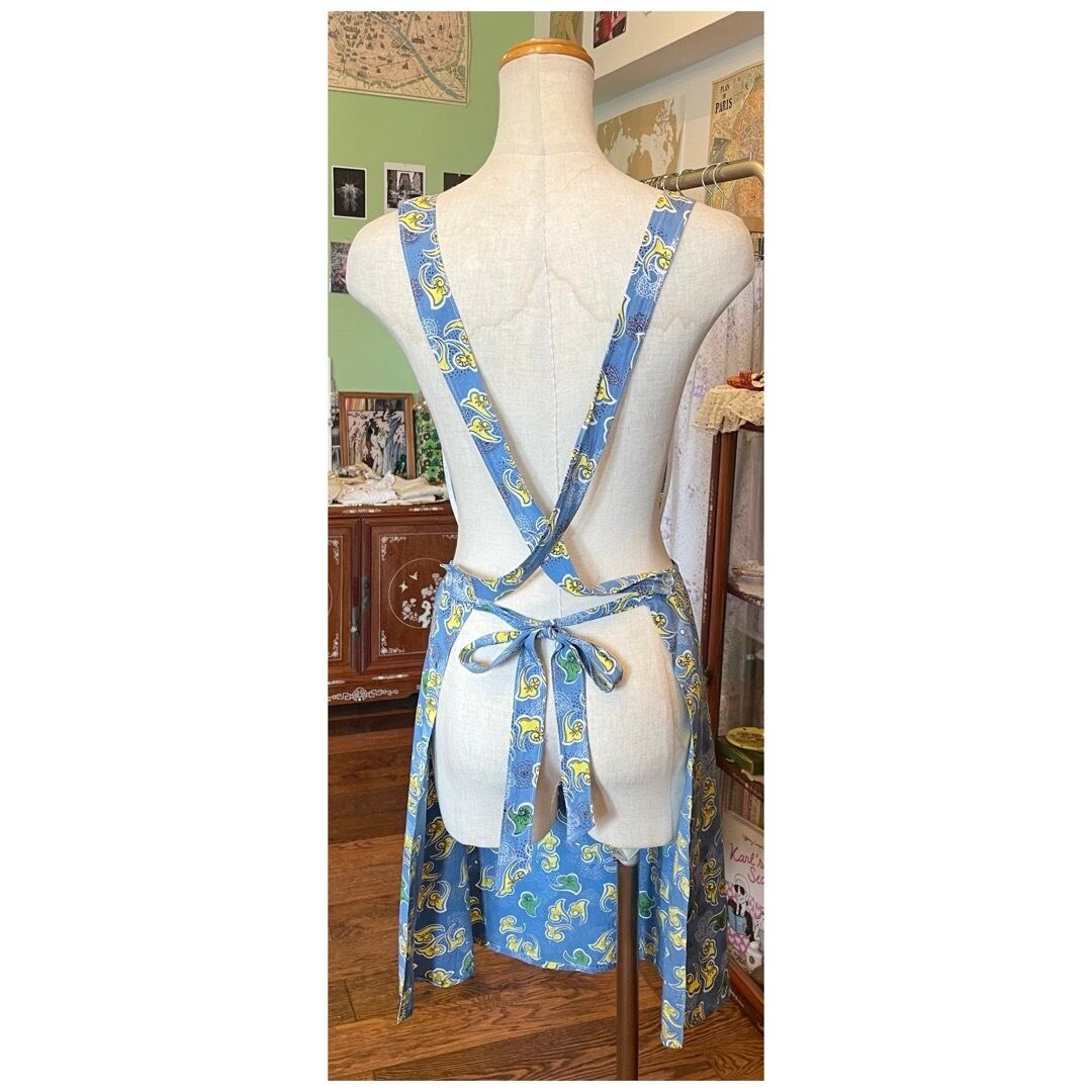 ベルギーはブリュッセルにて買付けましたヴィンテージエプロン。淡いペールブルーカラーに、ペイズリーのような、リーフのようなモチーフ柄が目を惹く、なめらかな生地感のファブリックです。白のパイピングを効かせたディテールも素敵。さりげなく日常に彩りを添えてくれる、雰囲気のある1枚です♡