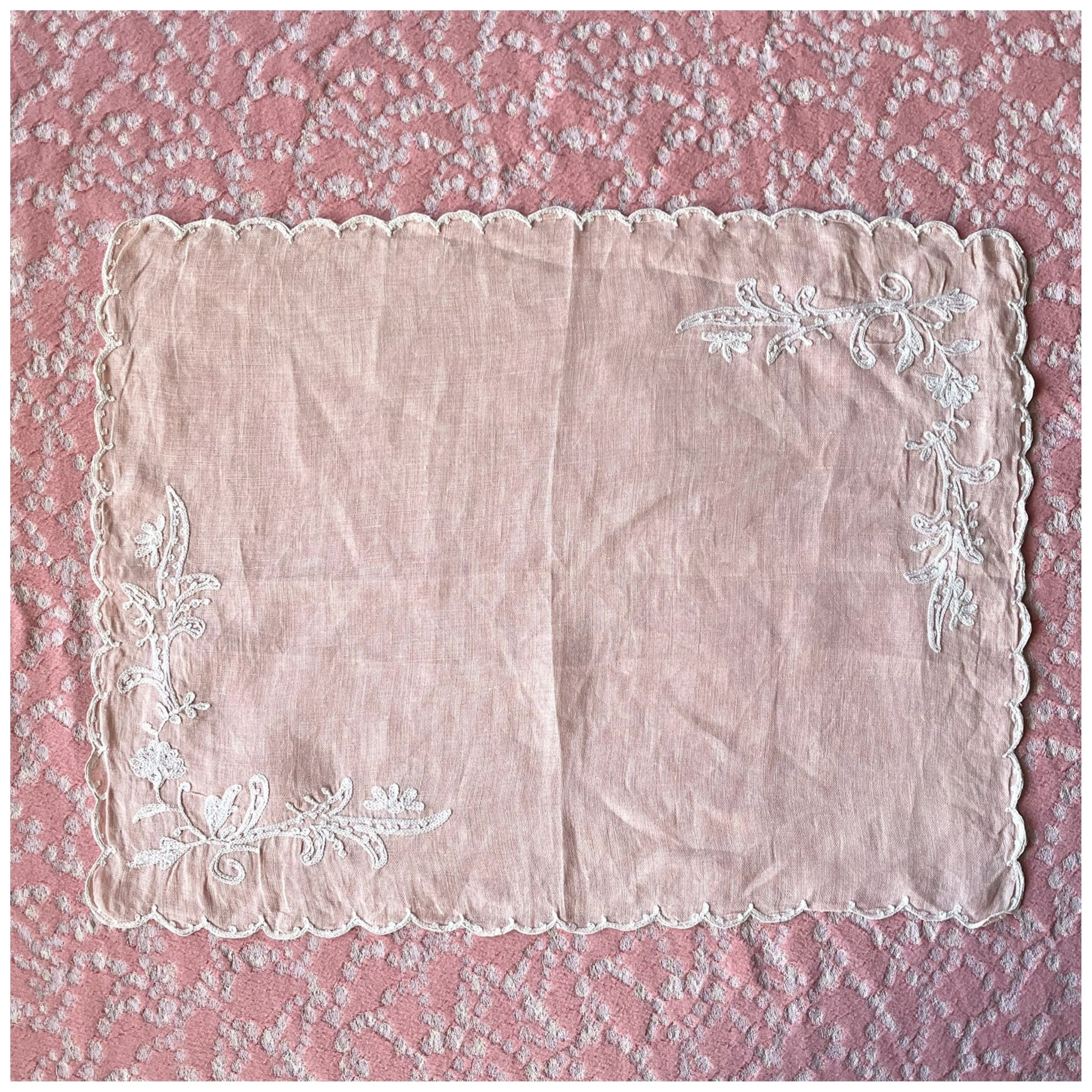 フランス ヴィンテージ 刺繍クロス ティークロス スカラップ ベビーピンク 2枚セット