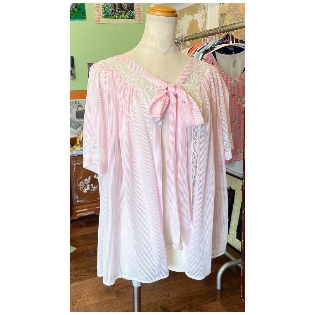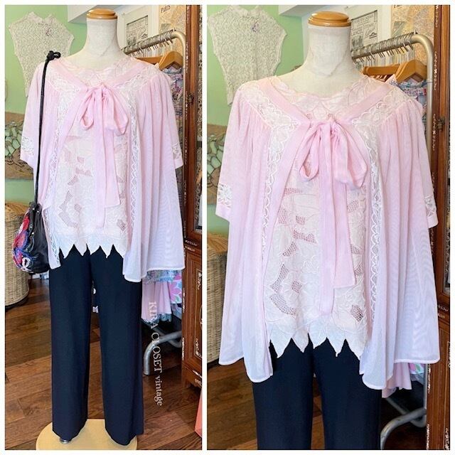 フランス ヴィンテージ ガウン ブラウス シアー レース ストライプ リボン ピンク