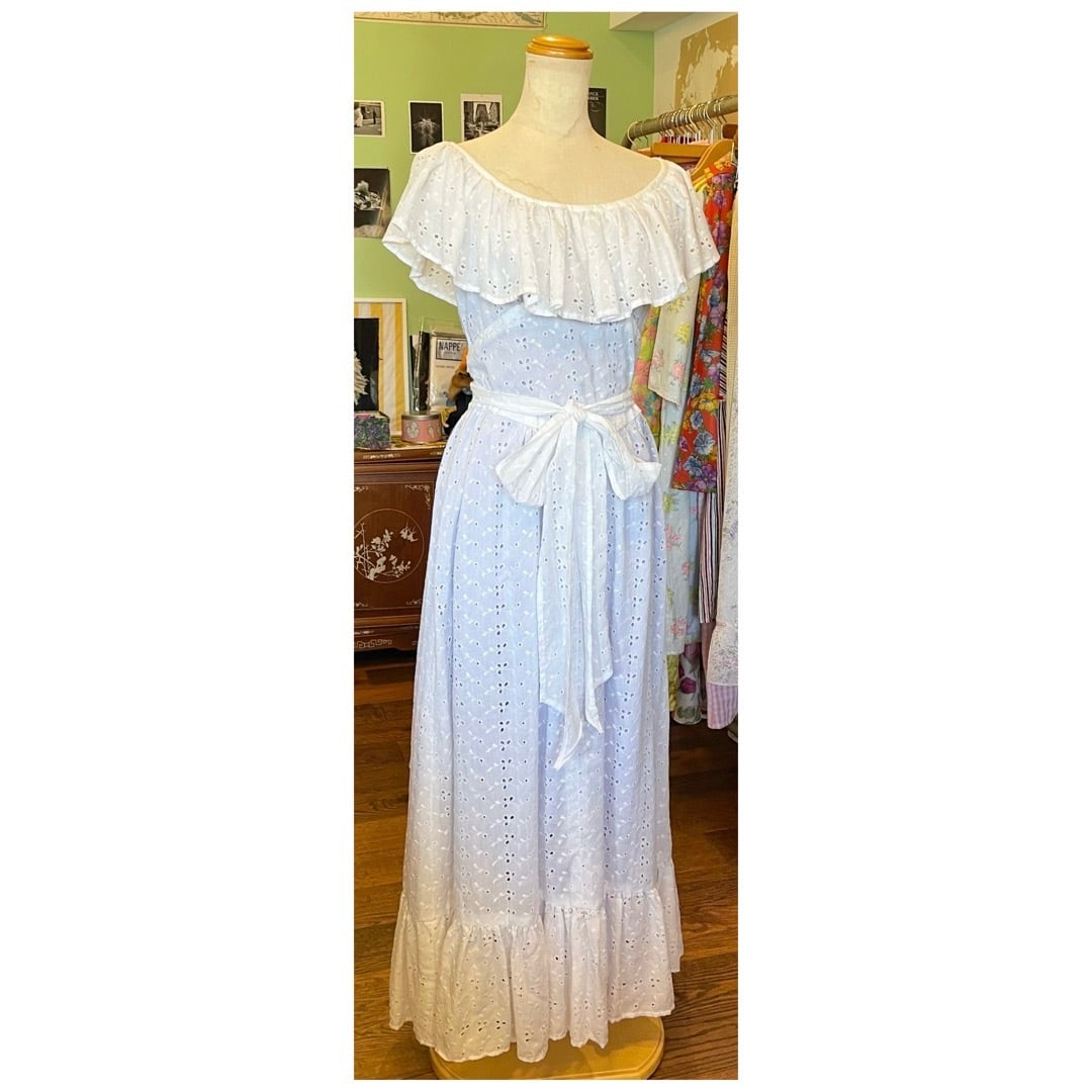 US ヴィンテージ ワンピース コットンドレス フリル カットワーク ラベンダー ホワイト 送料無料
