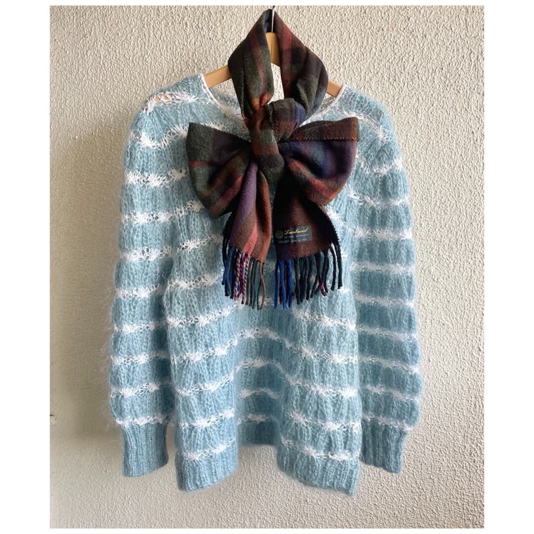 【春色ニットSALE】】フランス買付 ヴィンテージ デザインニット パフスリーブ リボン編み 透かし編み ペールブルー 送料無料