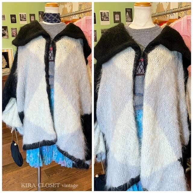 フランス買付 ヴィンテージ ニットコート モヘア ビッグカラー ボリューム袖 ダイヤ グレー