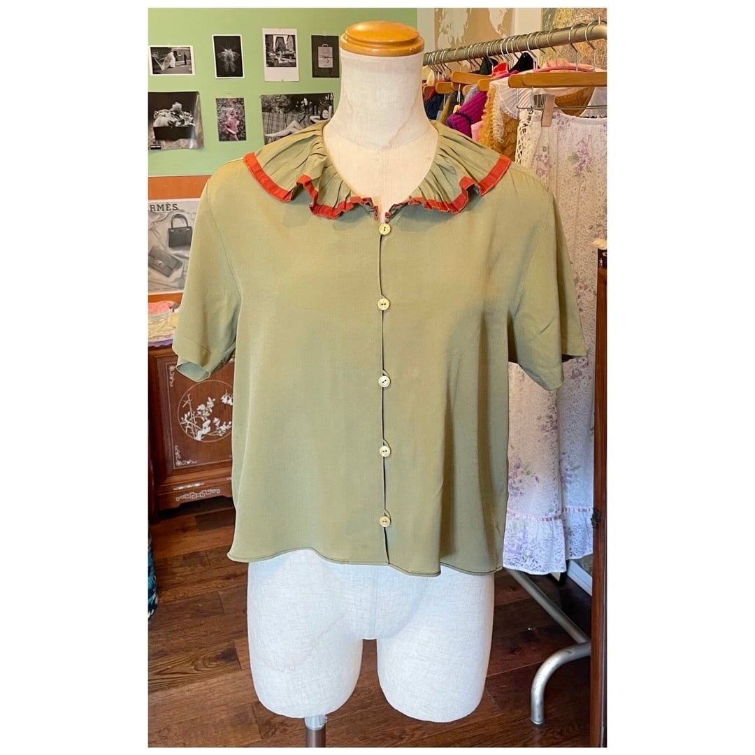 フランス買付 ヴィンテージ ブラウス プリーツ襟 シルク モスグリーン